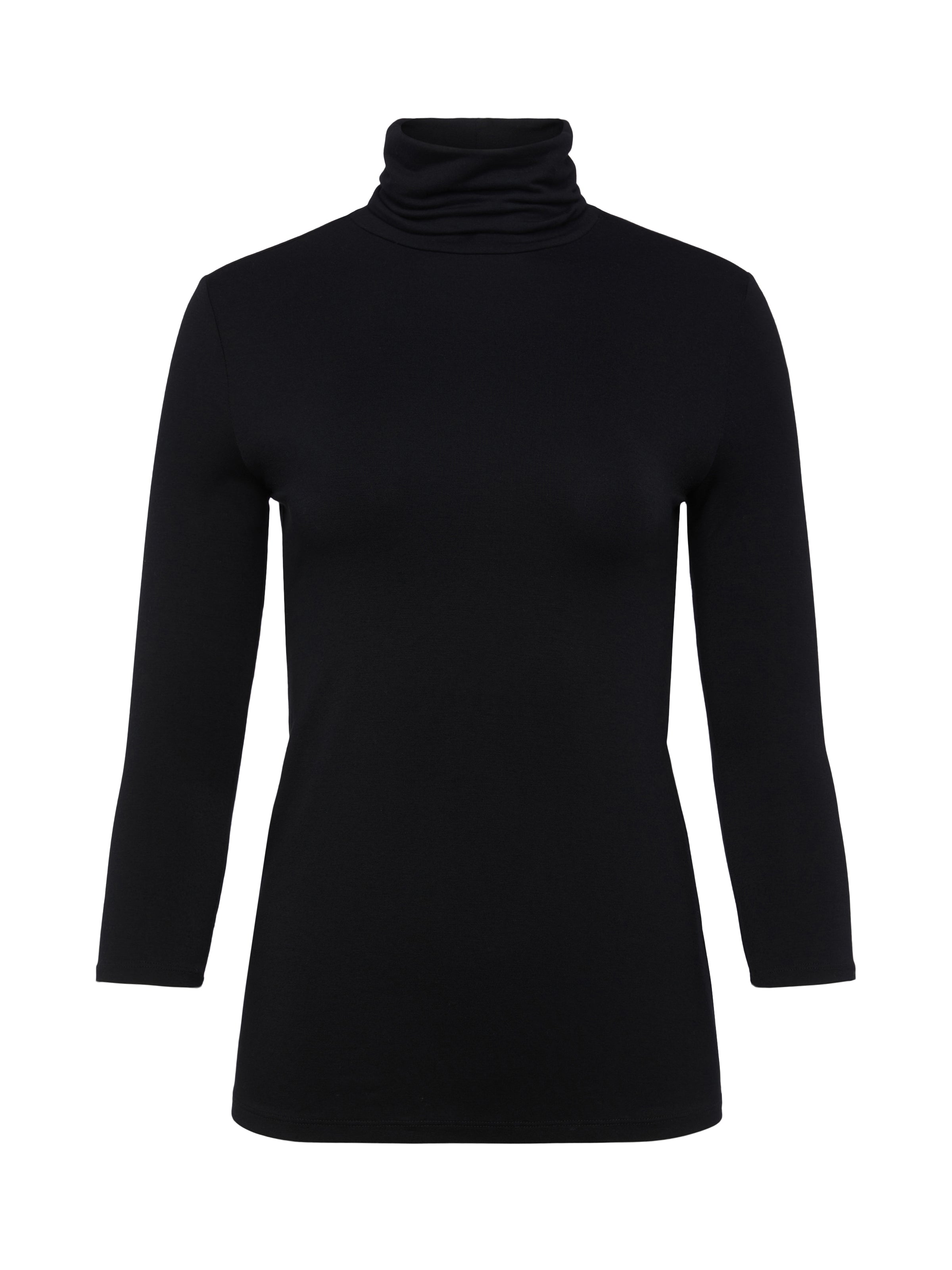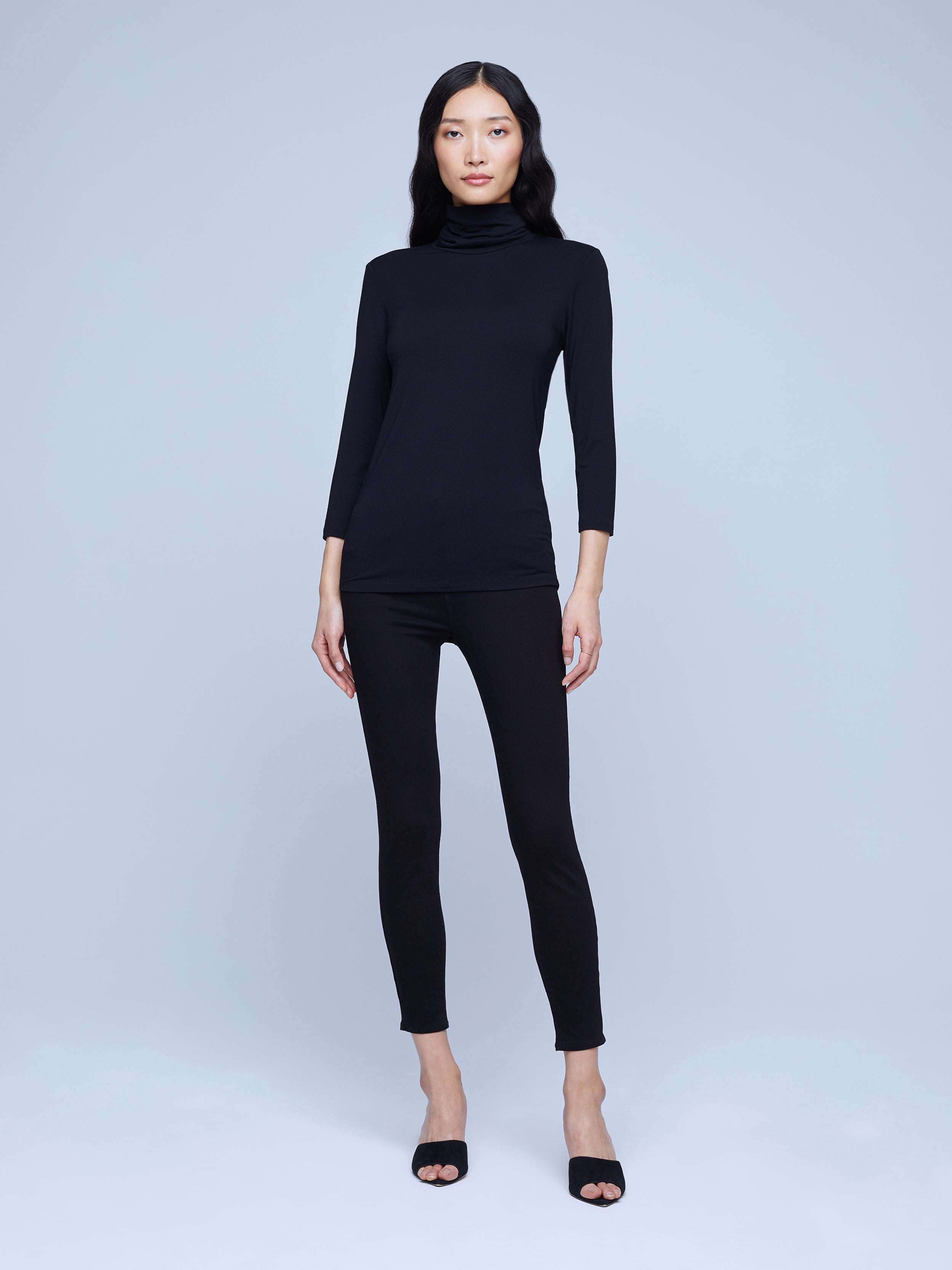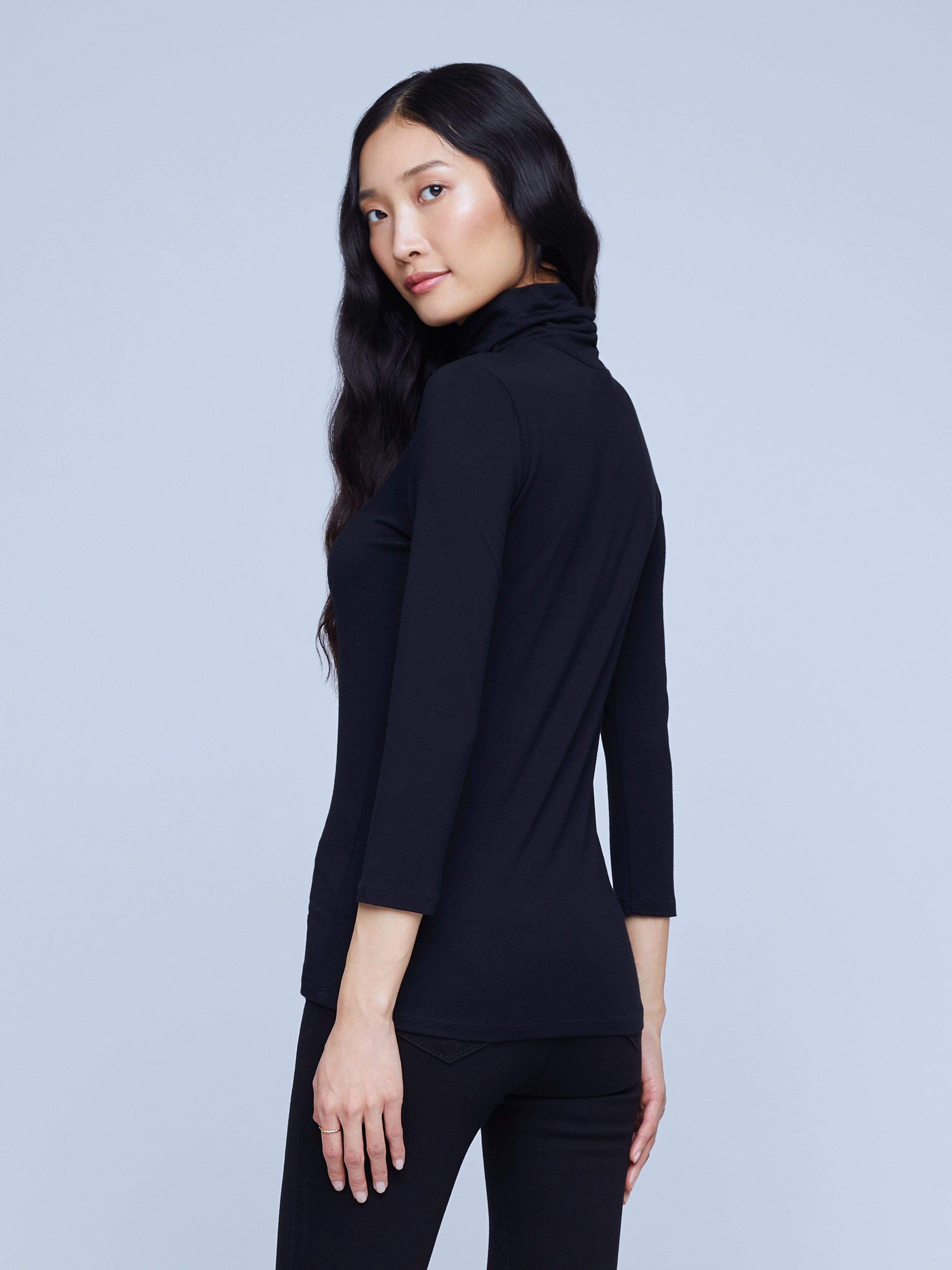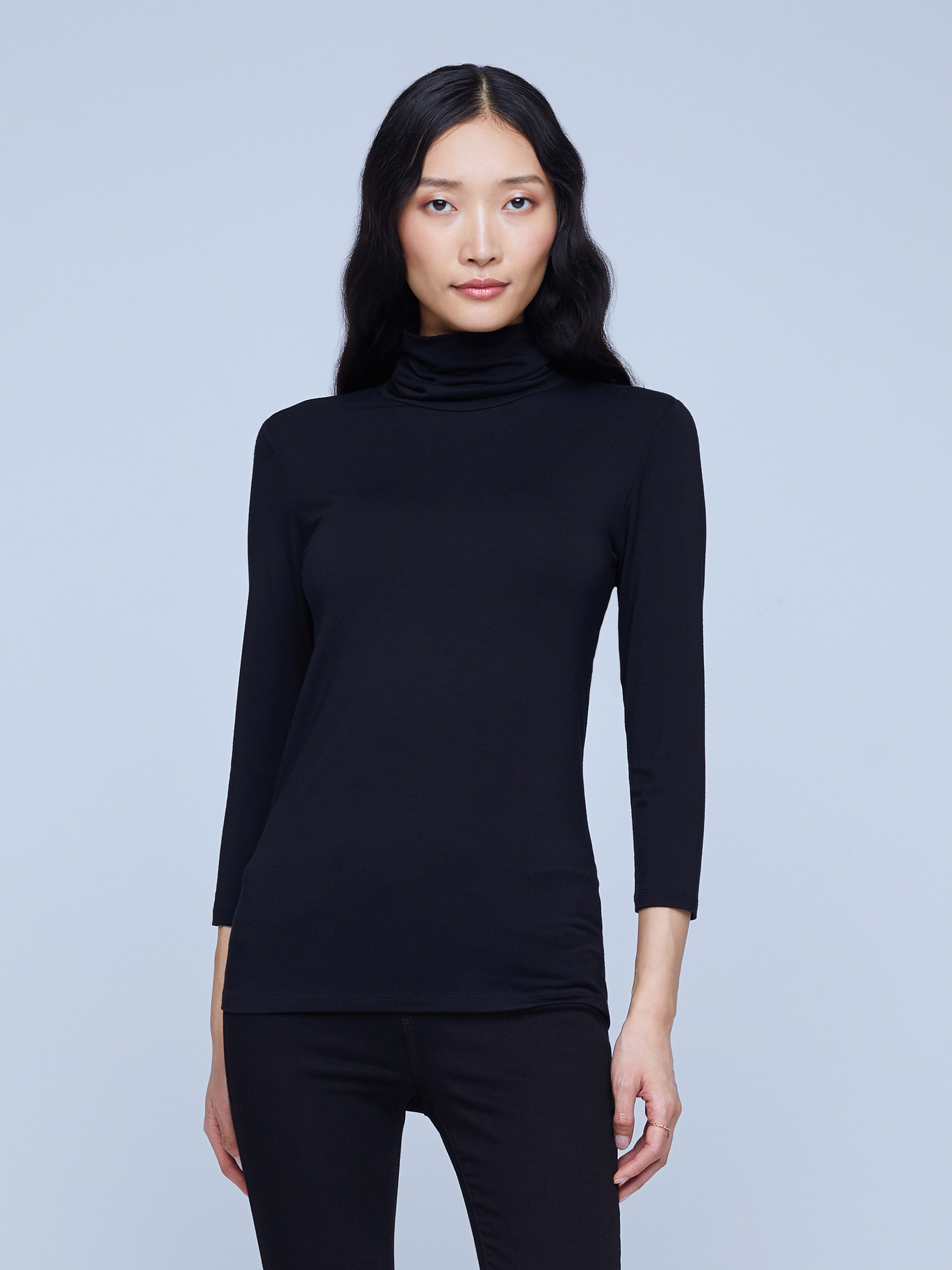An essential, slim-fit black turtleneck with a three-quarter length sleeve. Ultra-soft luxe microfiber fabrication provides supreme comfort while smoothing the silhouette. Aja pairs and layers easily with a blazer and jeans.