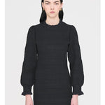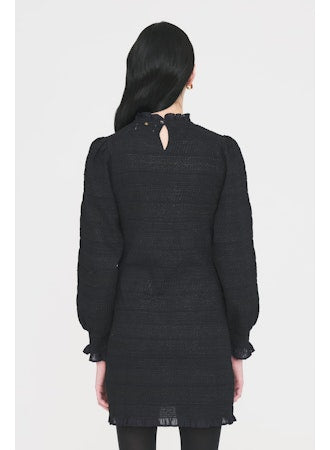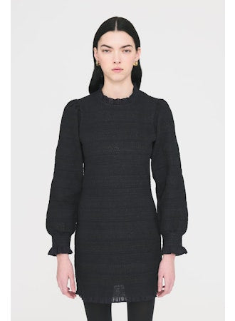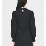 The perfect little black dress every wardrobe needs for fall and winter. The chic and timeless, like the subtle ruffles along the neckline, wrists, and hem, details make it great for all occasions.