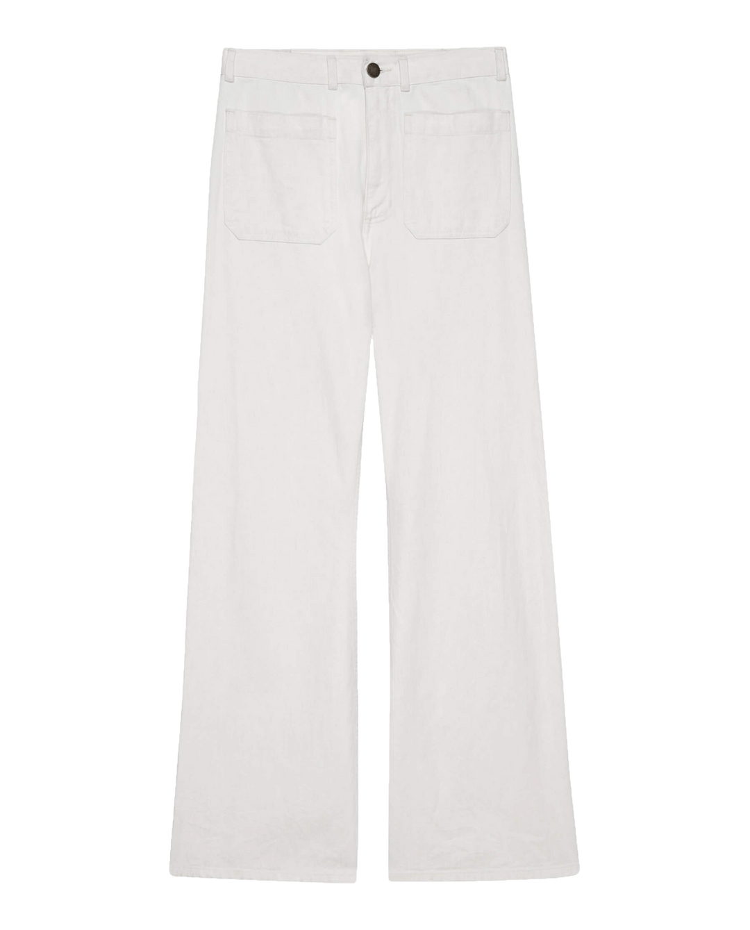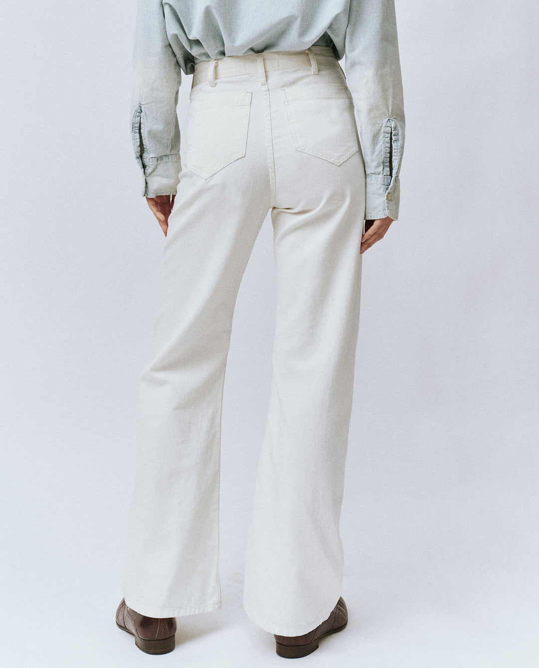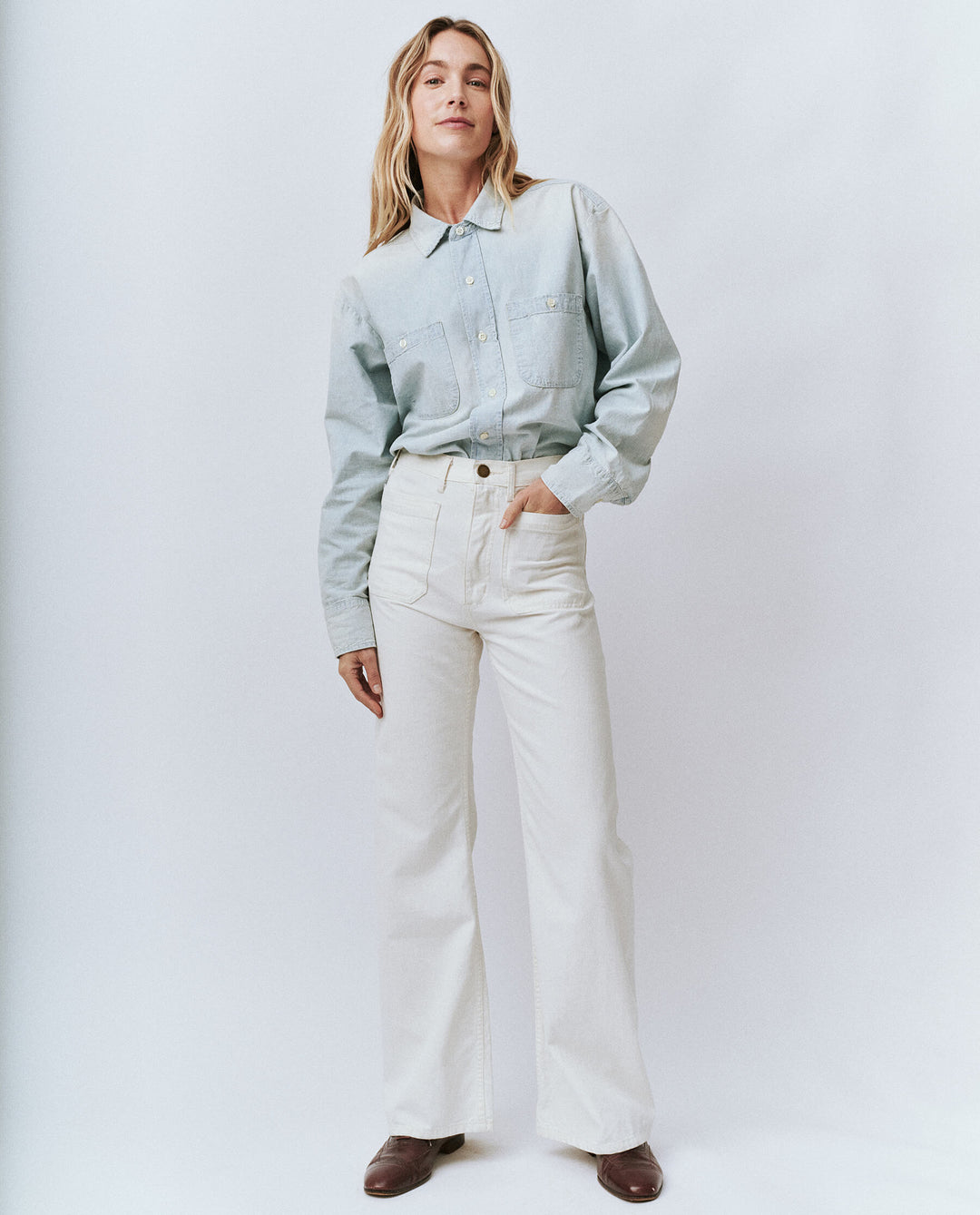 The Dock Jean is an update to a timeless pair that transcends seasons. Reminiscent of ‘70s denim, this new bell-shaped sailor jean is high-waisted with the most charming kick that hits just below the ankle. The leg inseam features a subtle horseshoe shape for a flattering leg, sailor patch pockets, and a zip fly with metal button closure that completes the look that you can take day to night.