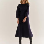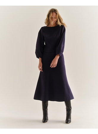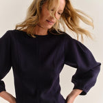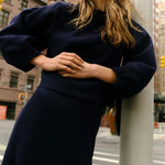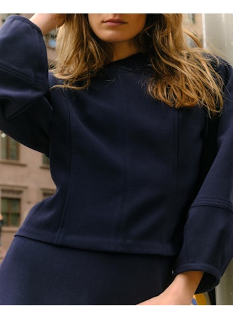 Striking in midnight crepe, this top frames the neckline with sculptural pleats while keeping a sleek, tailored silhouette. A modern essential that layers beautifully or makes its own statement.