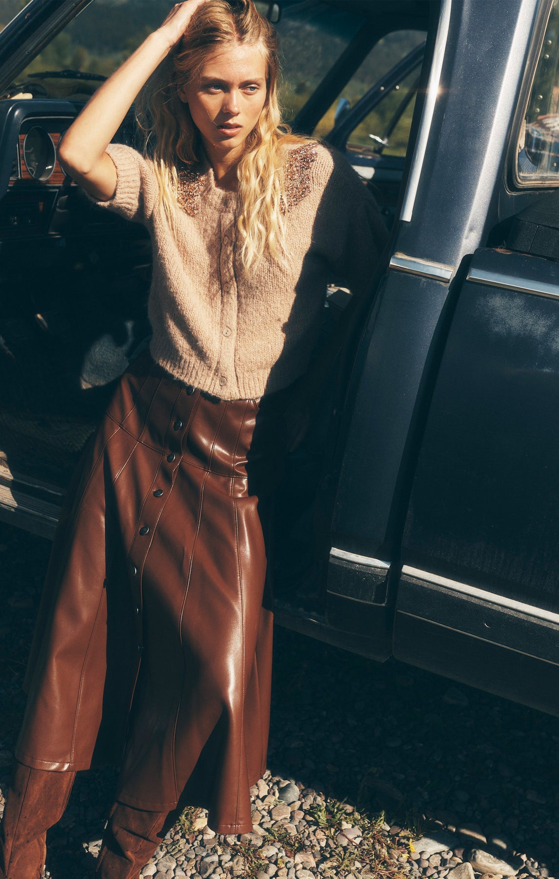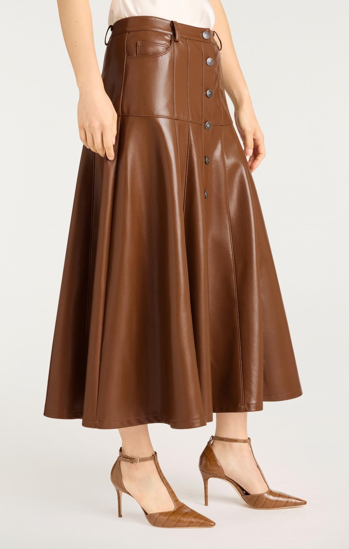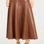 The Veena Skirt features a sleek midi length cut crafted from vegan leather for a refined fall look. Its flowy silhouette flatters every step, combining modern edge with effortless style. Perfect for elevating your seasonal wardrobe.