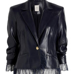 Introducing the Vegan Leather Le Petit Roxie Blazer. With the same delicate lace detailing and flattering silhouette, it is now crafted with premium vegan leather, adding a bold and polished touch. Its sleek design combines elegance with contemporary style, ensuring you stand out with refined flair.
