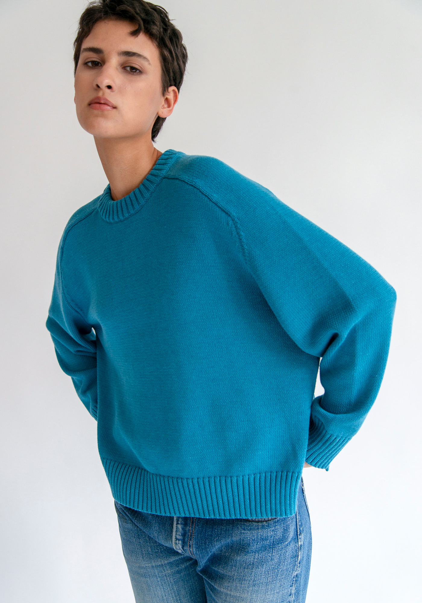 Relaxed fit crewneck with slightly fuller sleeves, side slits, and doubled rib trim at the neck.