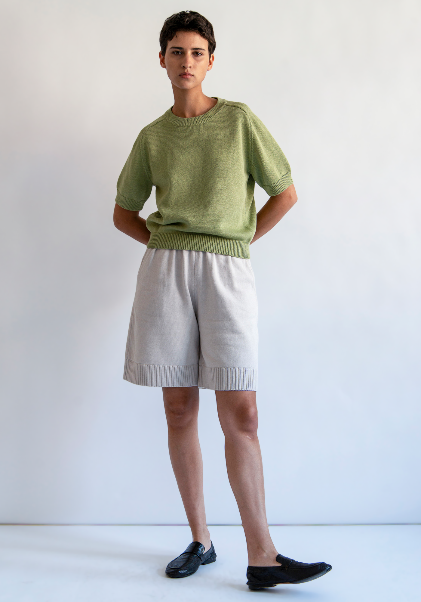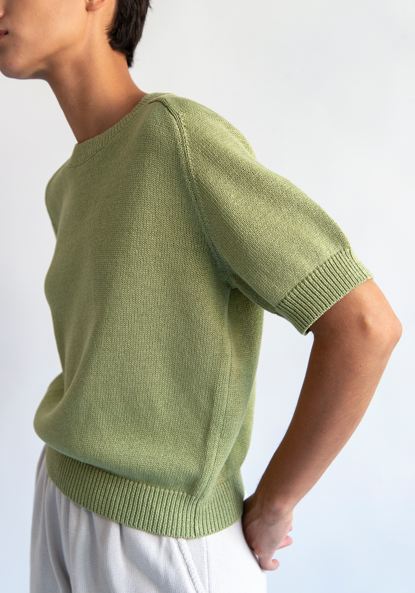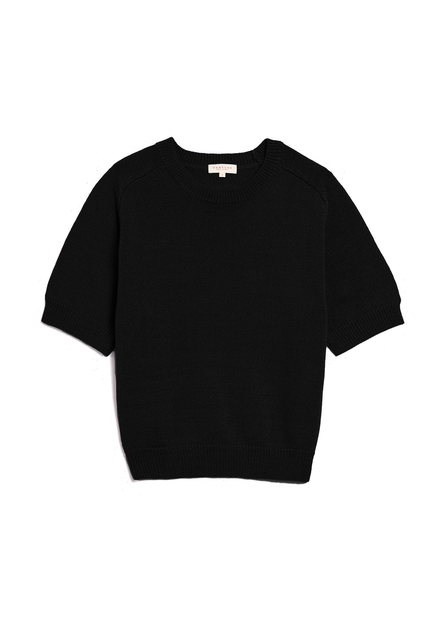 Slightly cropped short sleeve crewneck top with raglan sleeves.