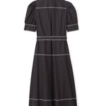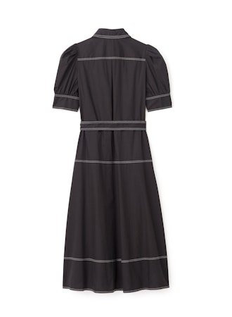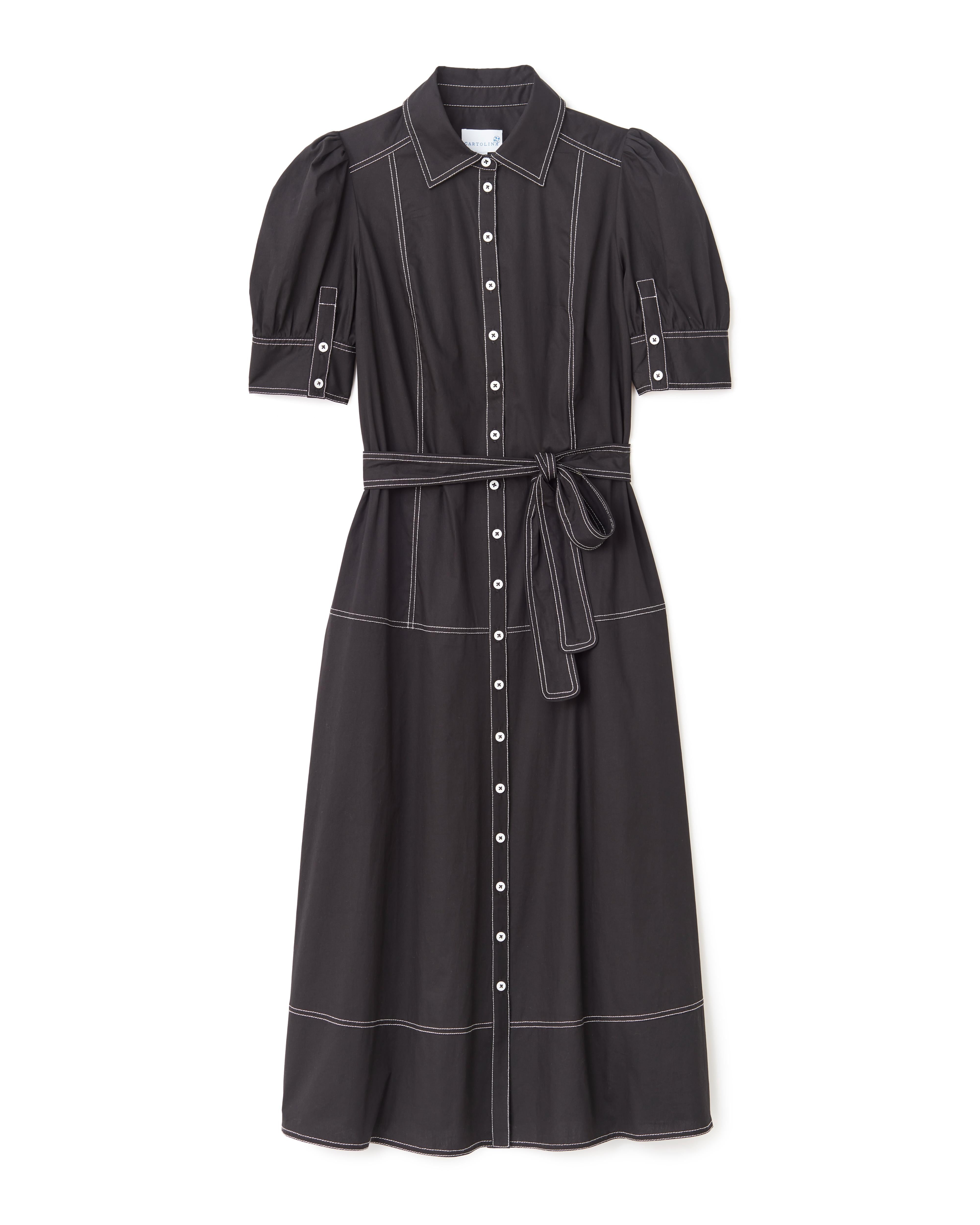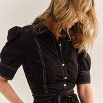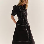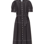 Effortlessly refined, the Francesca Midi Dress in Noir combines modern structure with timeless femininity. Crafted from crisp cotton poplin, this button-down silhouette features contrast stitching that highlights its tailored lines, while a self-tie belt cinches the waist for a flattering shape. Puff sleeves add a touch of softness to the structured design, and the midi length pairs perfectly with boots or heels for versatile styling.