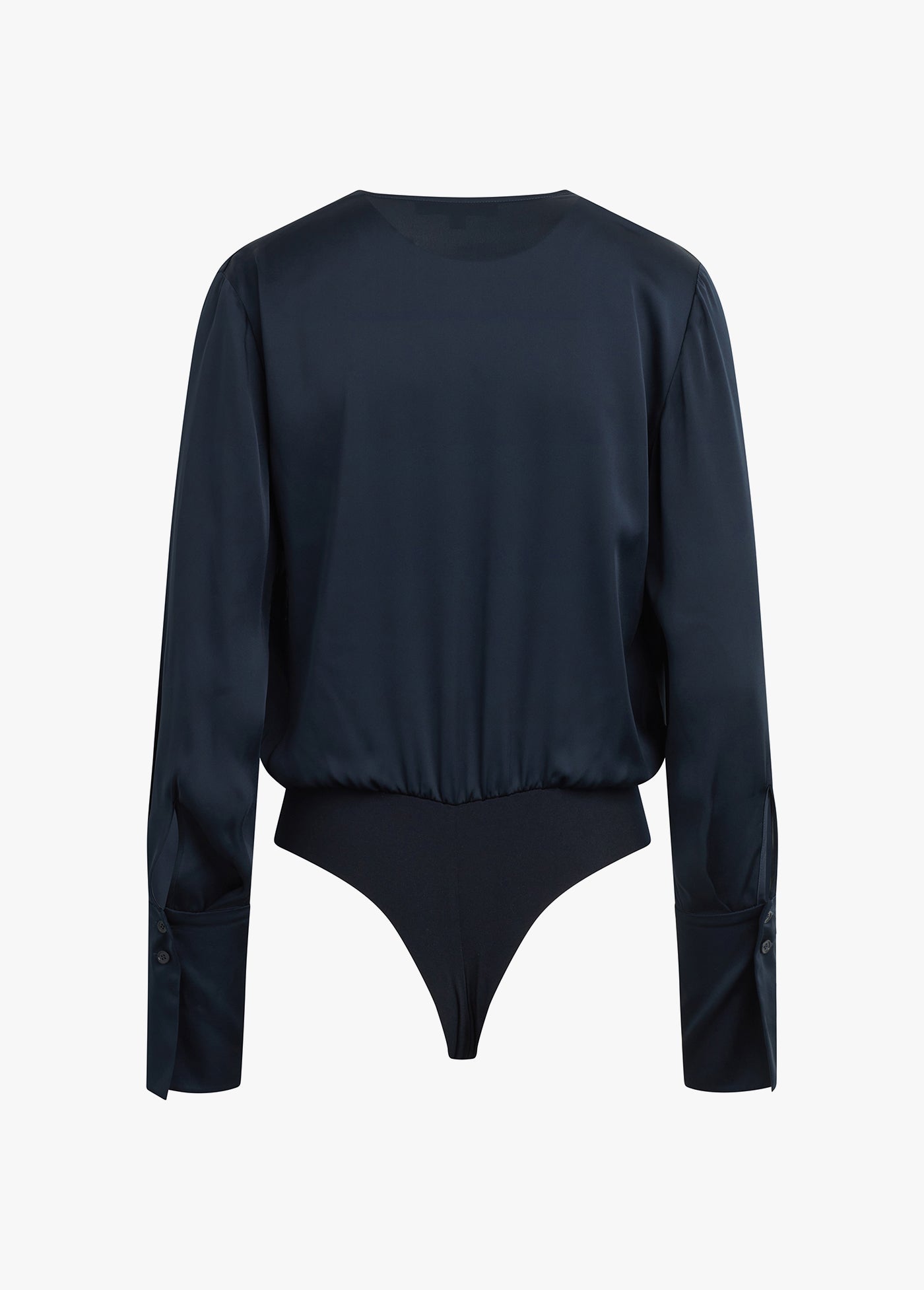 It's Swipe Right for this satin bodysuit with a draped and pleated neckline and button cuffs. This date night darling pairs best with high-rise denim and heels for cocktails on the couch, dinner downtown, or a virtual meet and greet.