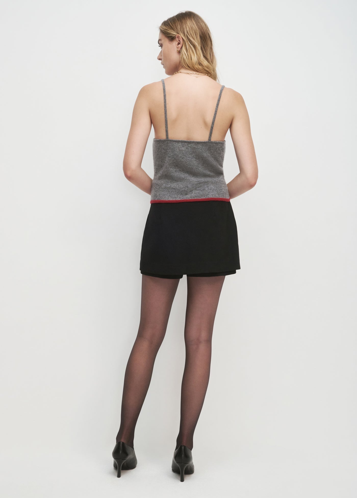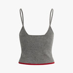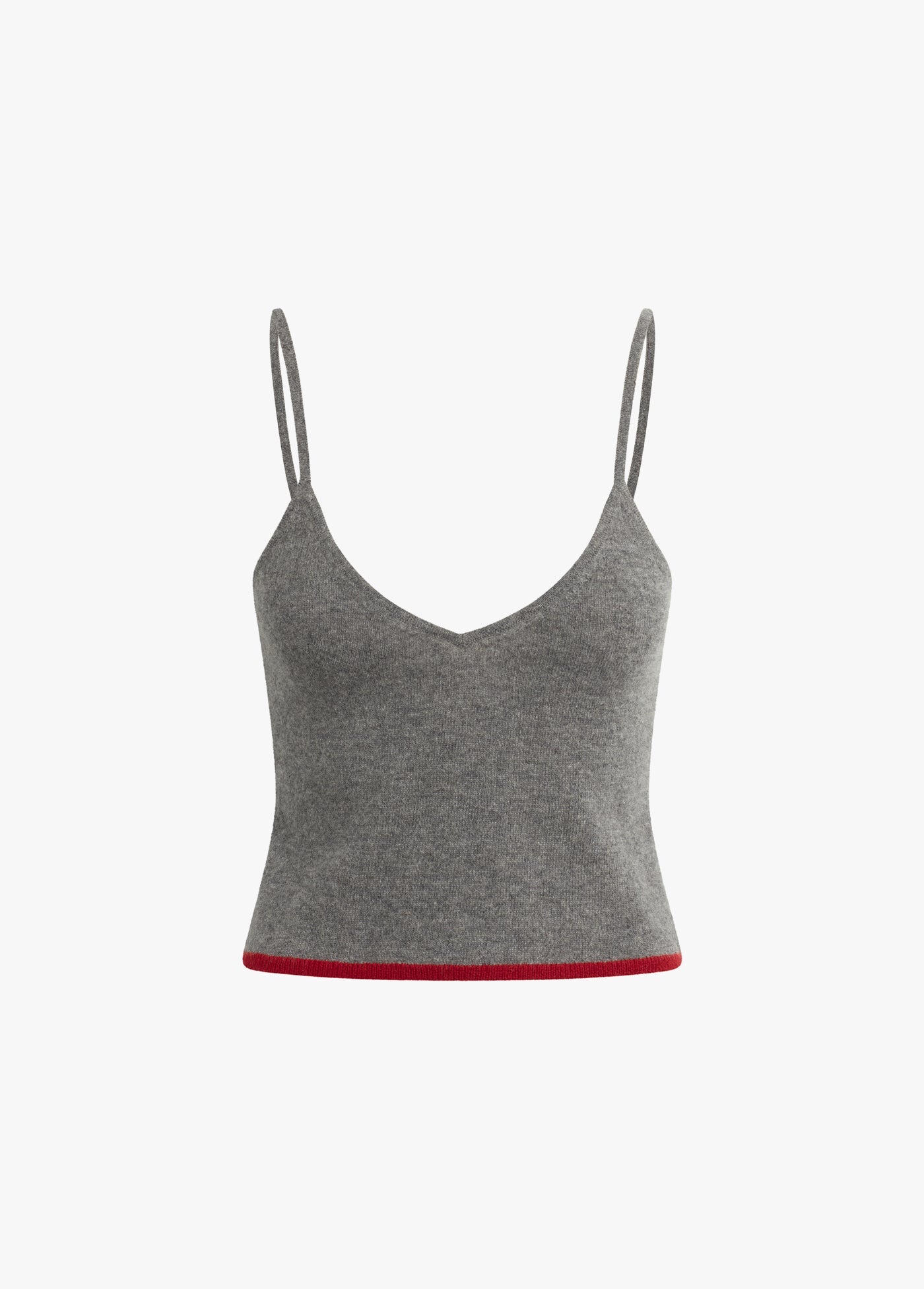 With pin thin straps and red hem trim, the Rebecca Cami is a super-soft cashmere favorite. With a slightly cropped fit, it looks great with everything but we especially love it styled as a set with The Cropped Rebecca Cardigan.