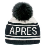 Black White Apres Ski Knit Beanie with Fox Fur Pom Pom