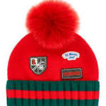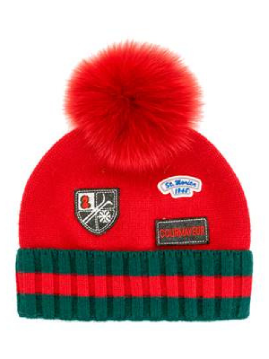 Red Knit Ski Logo Beanie with Fox Fur Pom Pom