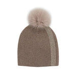 Taupe Beanie with Crystal Stripe & Fox Fur Pom Pom