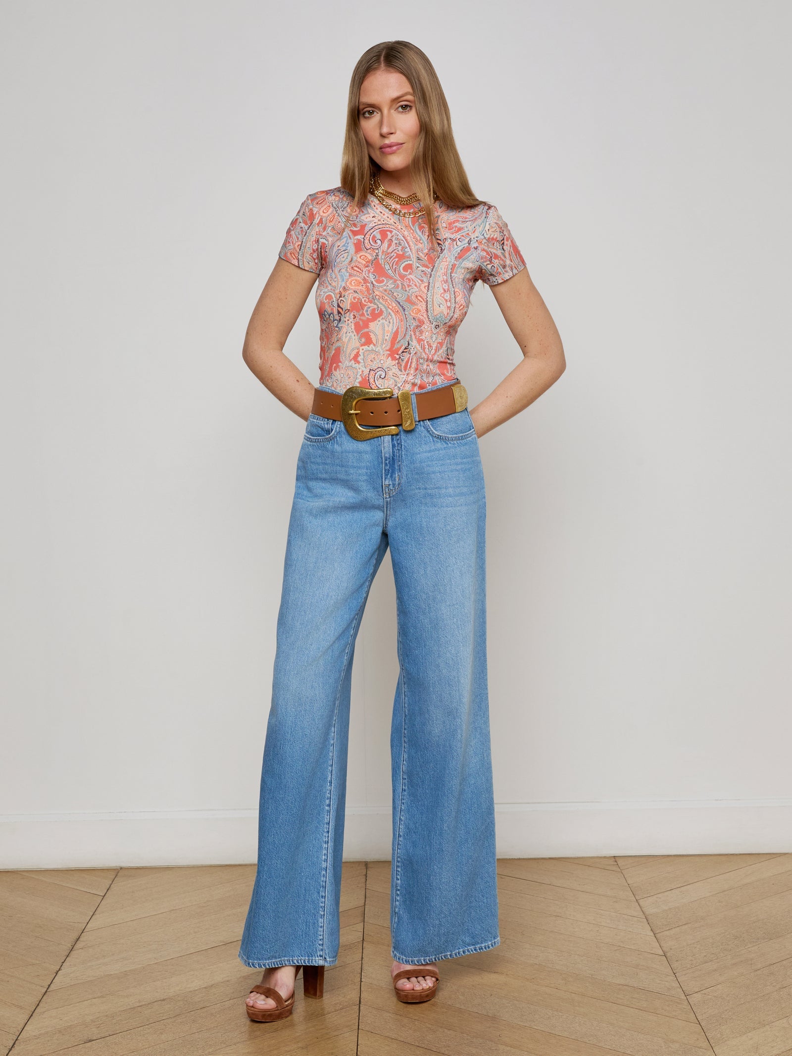 In a soft, supple fabrication and slim cut, Ressi is a flattering short sleeve tee. This L'AGENCE favorite is back in a paisley print.