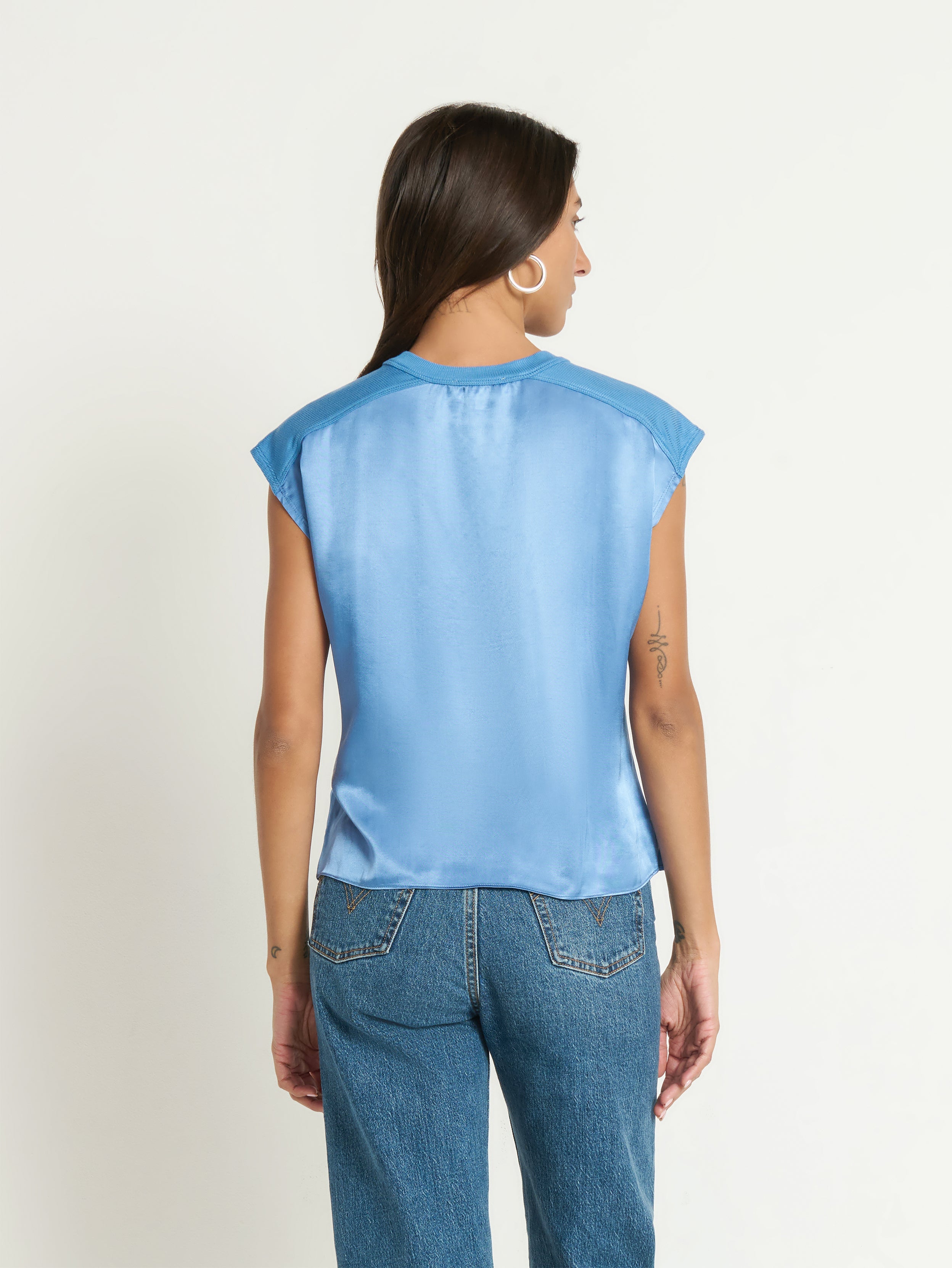 Easy to wear, breezy, and absolutely not basic, the Enya is made in a boxy, slightly cropped fit from hammered satin fabric and finished with a ribbing along the collar and shoulders. Smooth and drapey with a subtle sheen that mimics silk. Effortless and elevated—ideal for day-to-night styling.