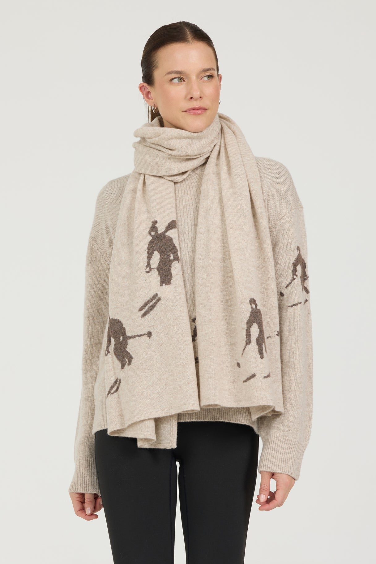 Inspired by the thrill of the slopes, this resort-ready travel scarf from the Après Ski Capsule blends warmth, whimsy, and winter charm. Crafted from a luxurious mix of 70% mercerized wool and 30% cashmere, it’s exceptionally soft, smooth, and lightweight ideal for chilly mountain air or cozy après moments. The playful skiers intarsia design captures the motion and joy of alpine adventures, making this generously sized scarf a standout accessory for travel, layering, and fireside lounging in style.