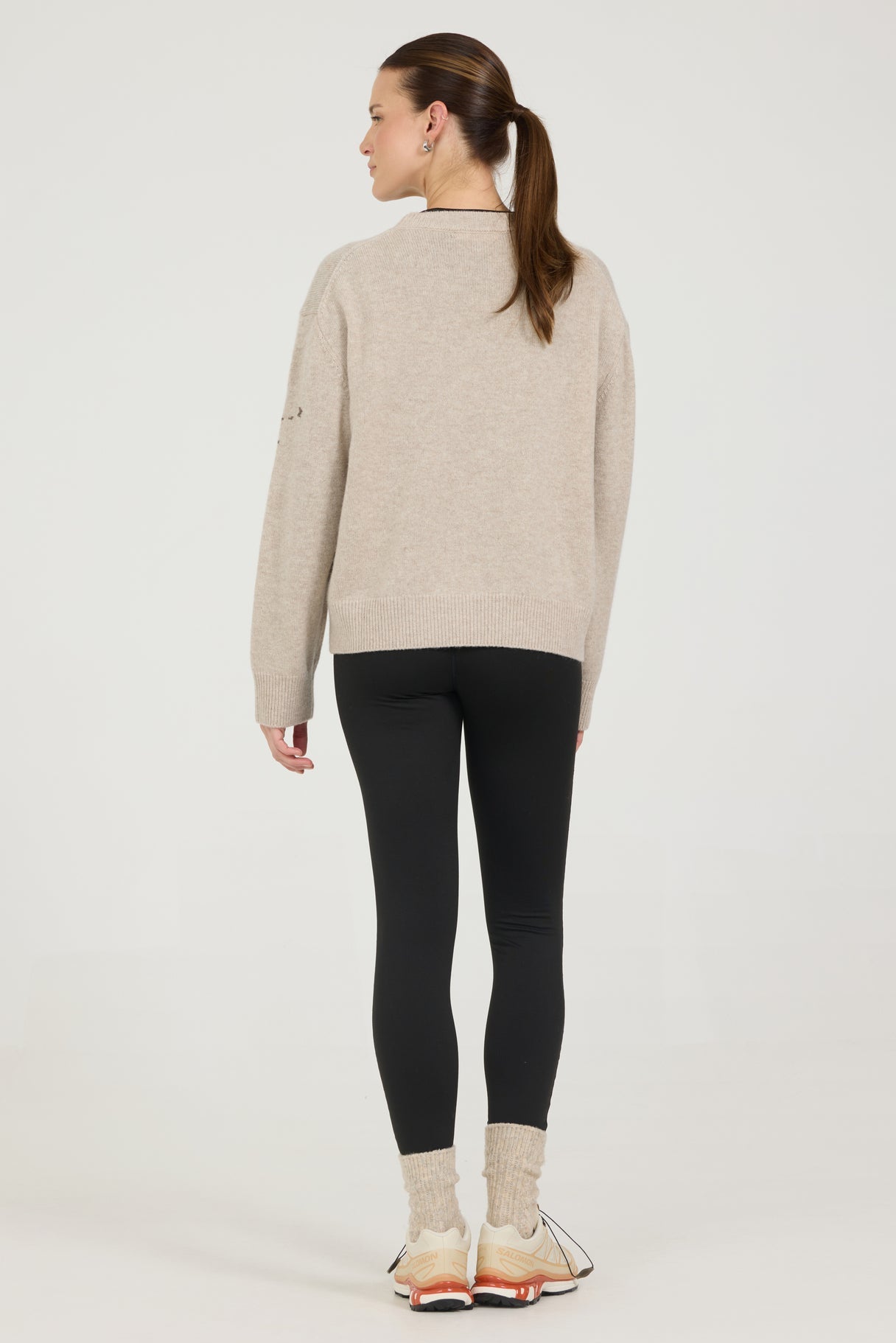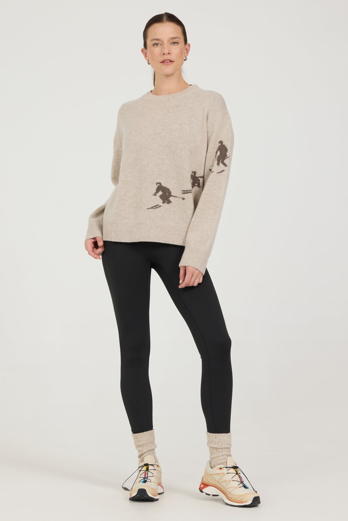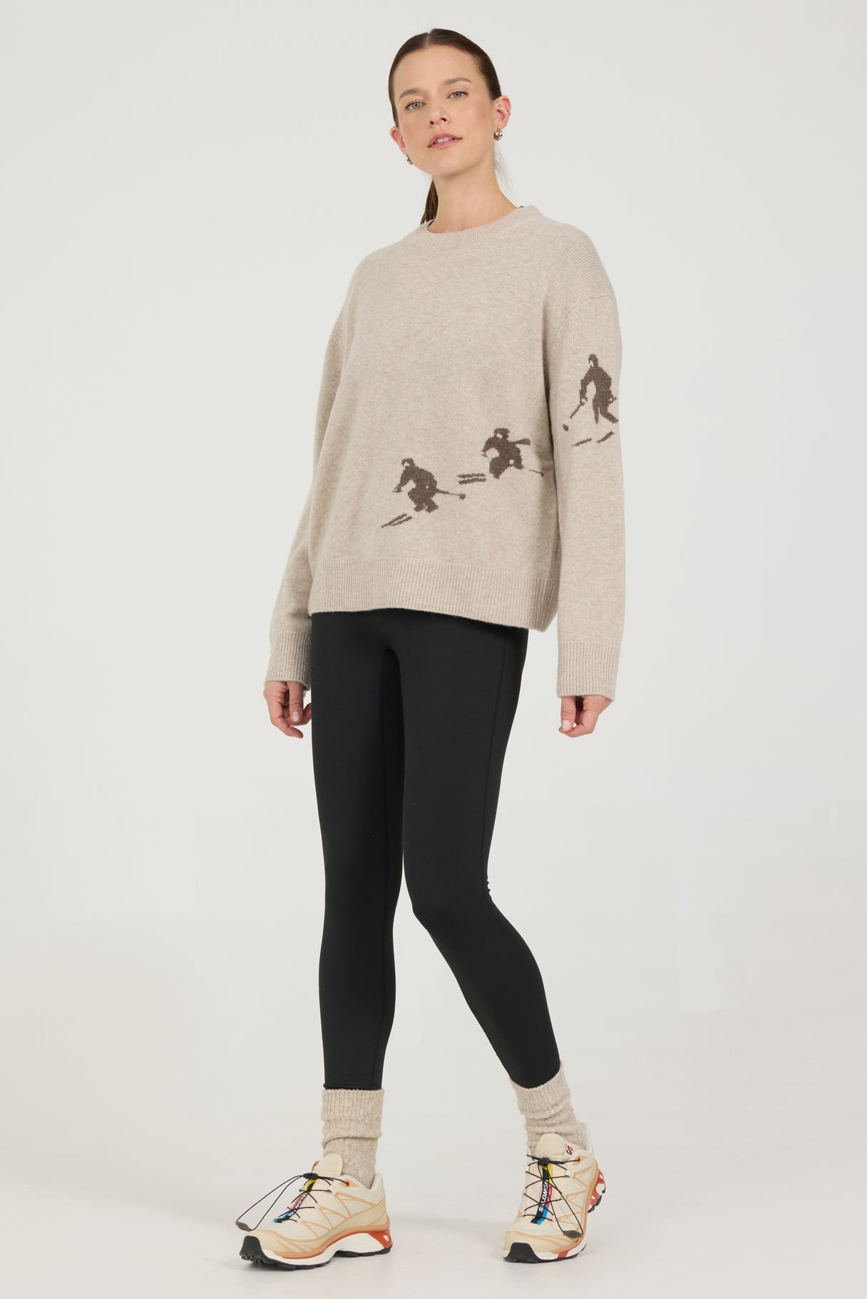 Channel the energy of the slopes with this playful pullover from the Après Ski Capsule. Crafted from a luxurious blend of 70% mercerized wool and 30% cashmere, it delivers a smooth, lightweight hand feel and plush warmth. The skiers intarsia graphic adds movement and charm, capturing the thrill of downhill runs in a bold, modern knit. With its classic crewneck shape and easy fit, this sweater brings winter whimsy and elevated comfort to any cold-weather wardrobe.