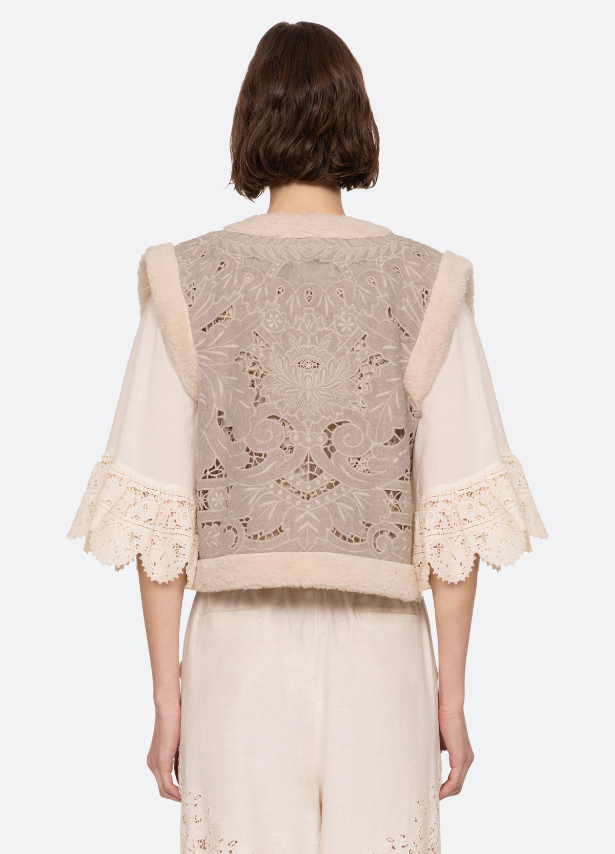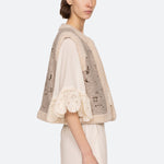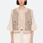 The Ceci embroidered vest features beautiful floral embroidery with delicate cut-out detailing. The shearling edge trim adds a cozy, luxe touch, elevating this vest to a statement piece for any wardrobe.
