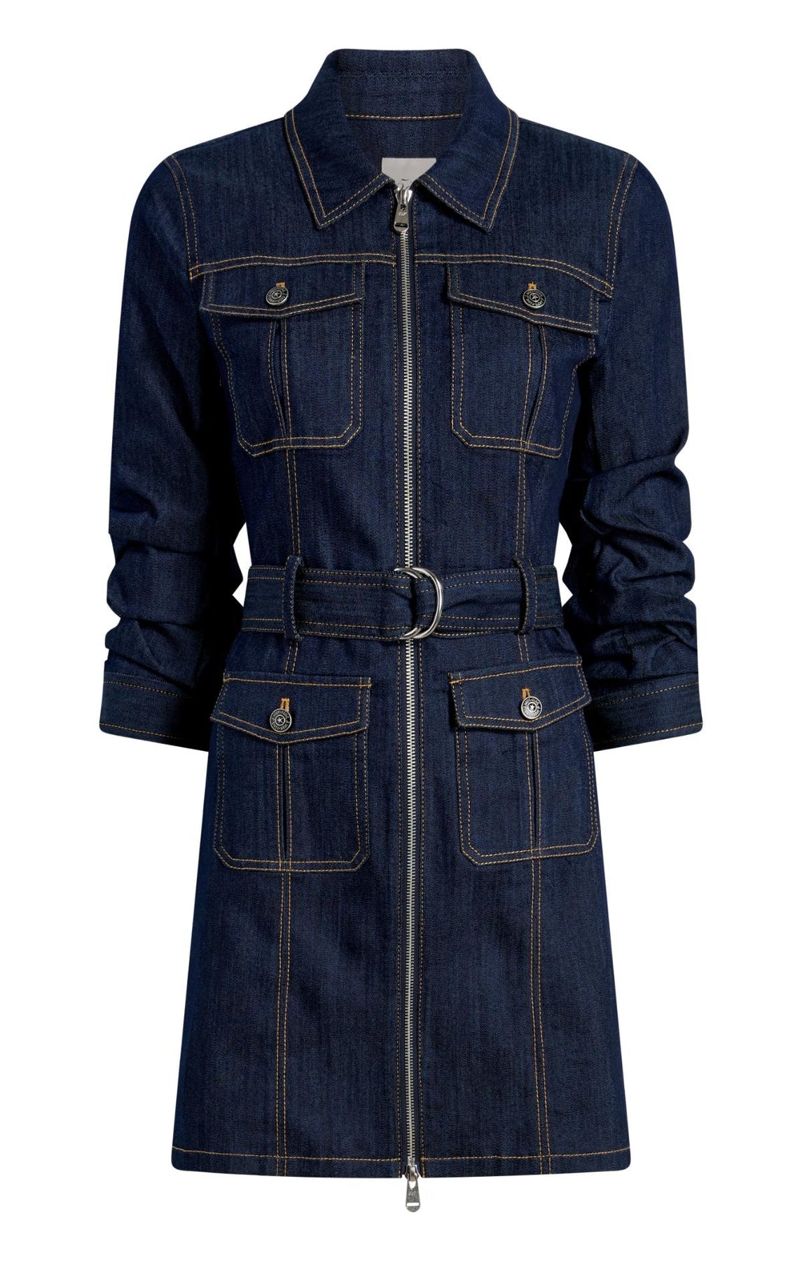 The Fauna Dress is a sophisticated denim mini dress featuring a zip-up front and a classic collar. Its scrunched sleeves add subtle texture, while the belted waist accentuates a flattering silhouette. Perfect for elevating your casual wardrobe with effortless style.