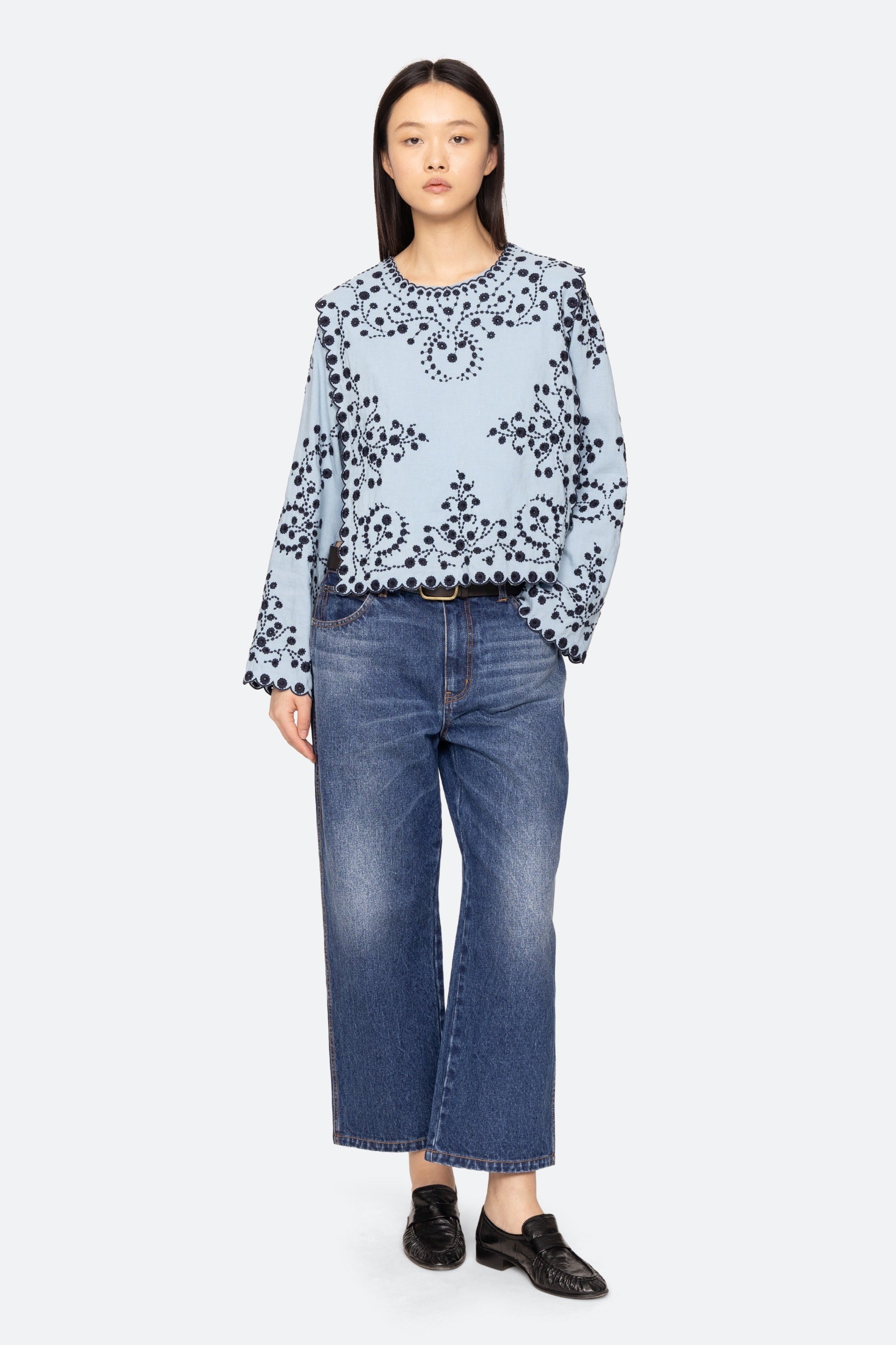 The Frances top is adorned with intricate floral embroidery and finished with scalloped edging. Flared sleeves add movement and a romantic touch to this feminine design.
