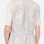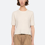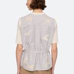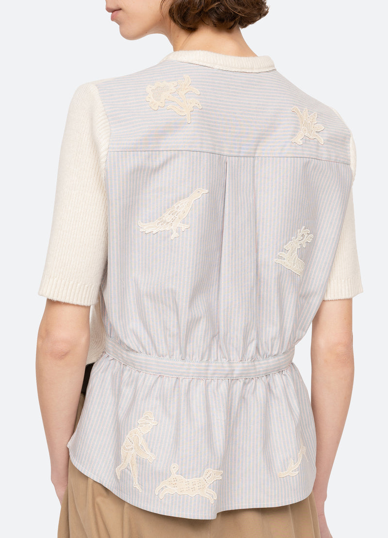 The Lavinia combo sweater features a contrast of textures, pairing a soft knit front with a crisp, striped shirting back. The delicate lace appliqué motifs on the back, add a playful twist to this everyday piece.