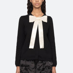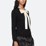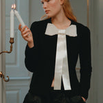 The Seraphine bow cardigan is defined by its oversized satin bow, embellished with delicate pearl accents, and finished with front pockets for a charming touch.