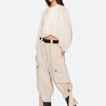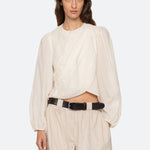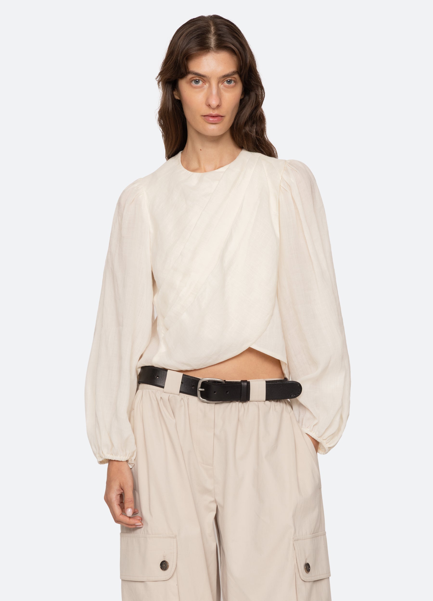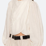 The Solene long sleeve top features voluminous puff sleeves and asymmetrical pleating for a textured detail. A tulip hem completes the design, adding a feminine touch.