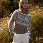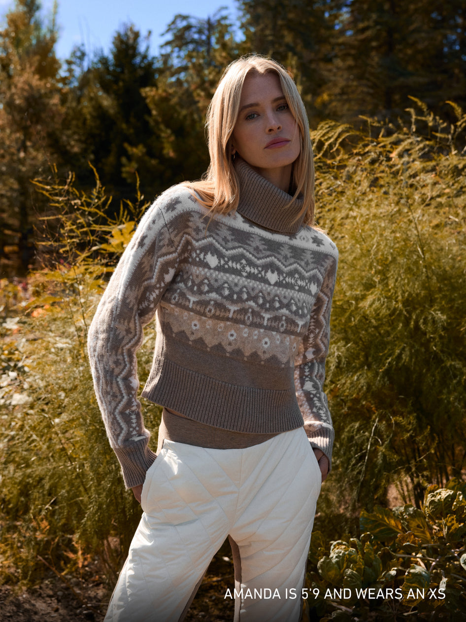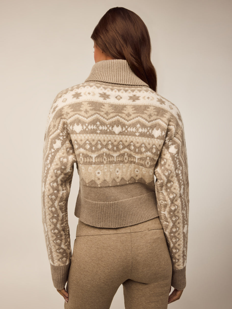 The Koko Turtleneck Sweater is crafted from a soft wool and cashmere blend that feels warm yet lightweight. Its relaxed silhouette is balanced by a cropped hem and wide ribbed trim for structure. The jacquard Fair Isle pattern adds depth and subtle contrast, giving it a classic look that's perfect for the season. Designed for effortless layering, it’s a chic cold-weather staple to keep you cozy and warm.