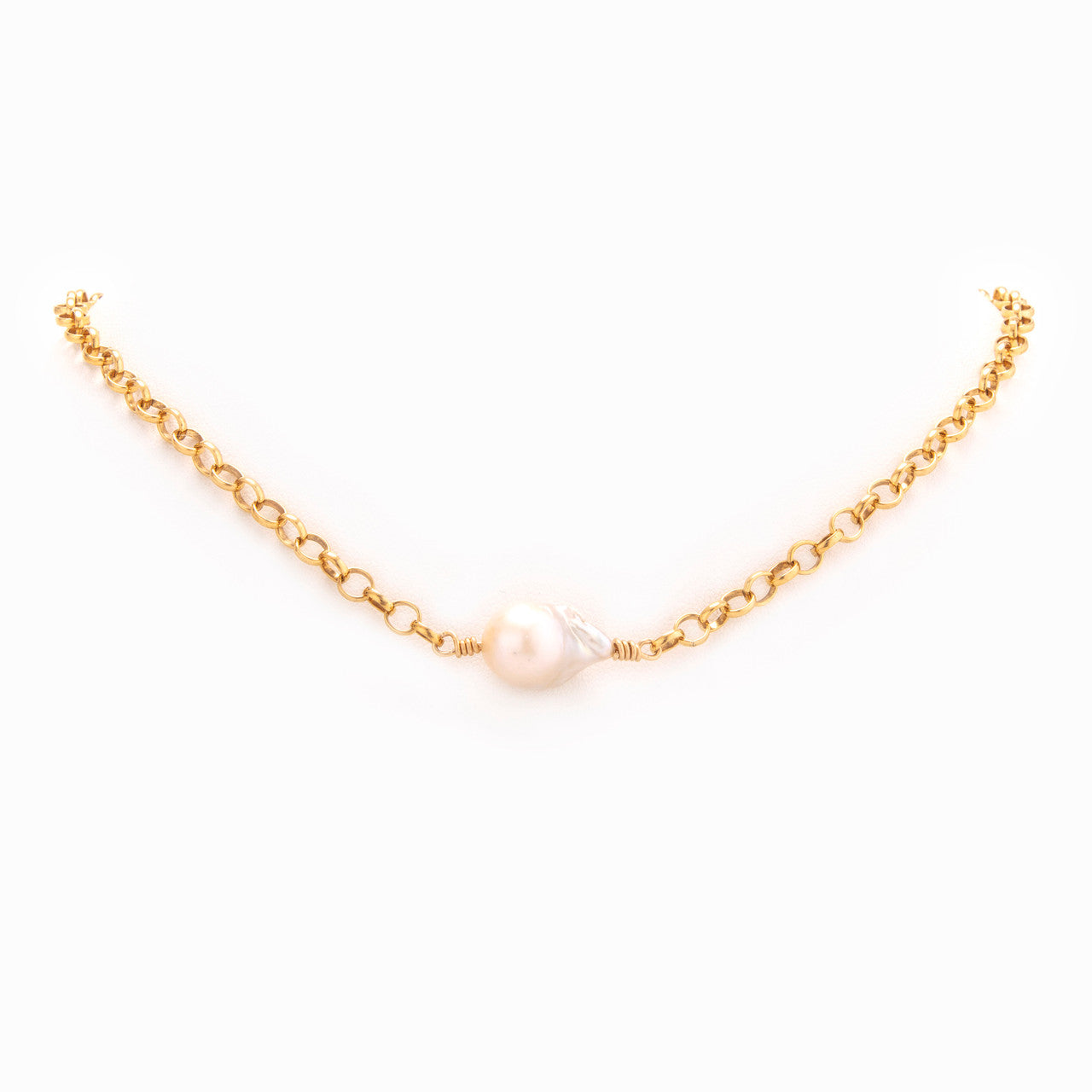Oversize white freshwater pearl with 14k gold filled rolo chain. This piece is worn high near the collar bone for the perfect effect. This piece can be worn by the beach or in the water where is belongs! It will never tarnish or change. Adjustable at the back for perfect fit.