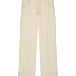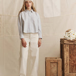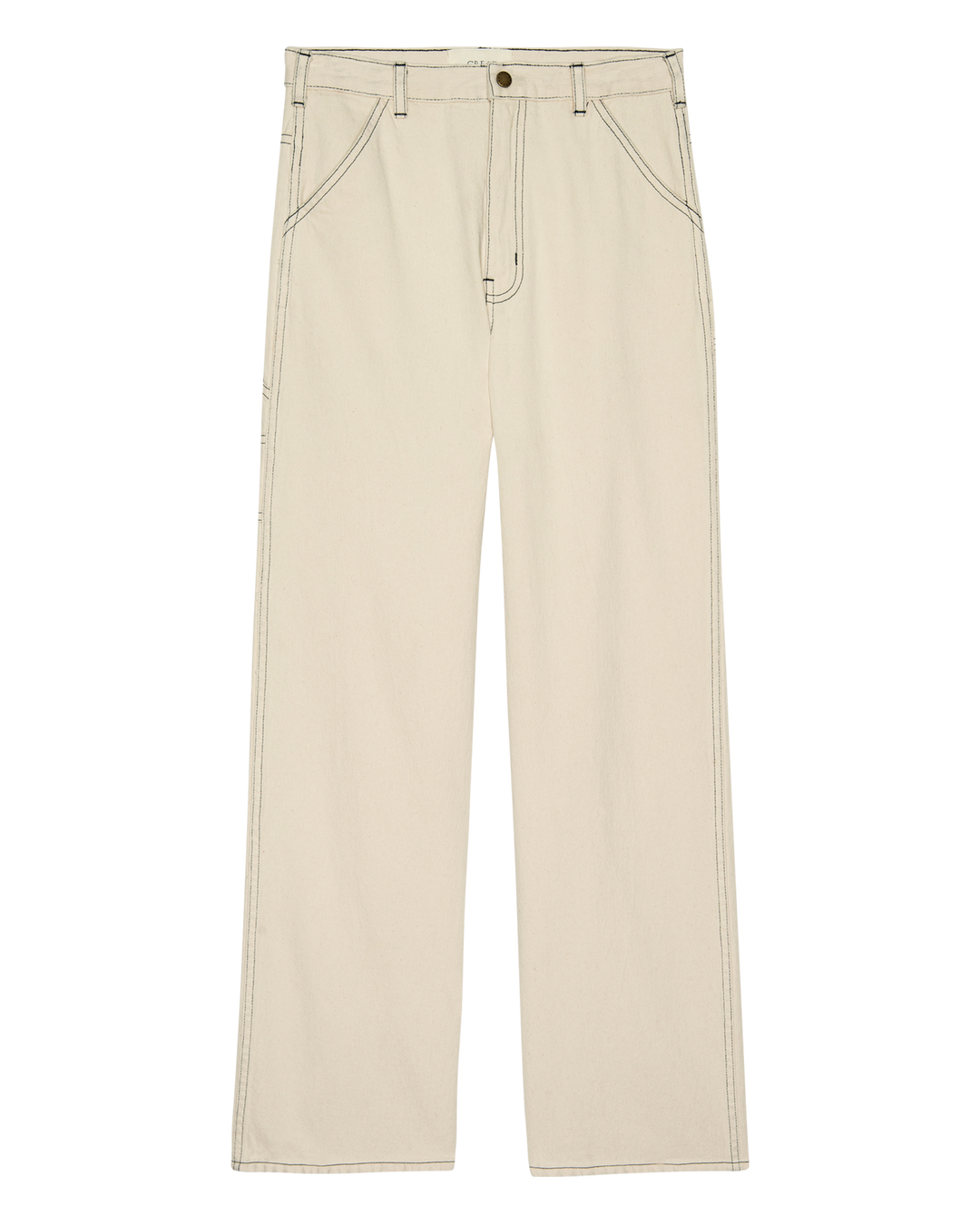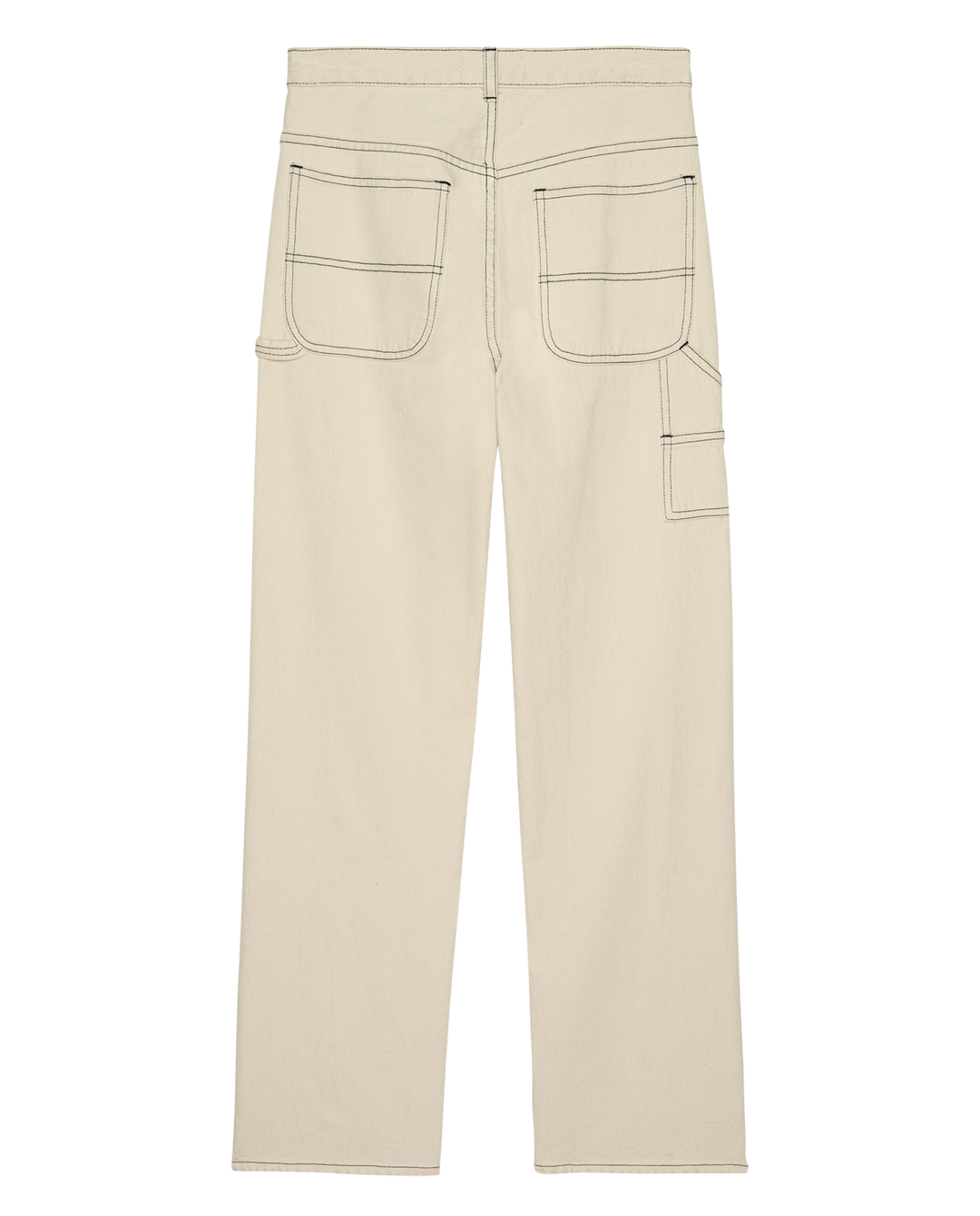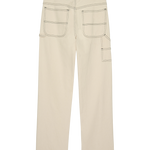 The Mill Jean in Natural with Navy Stitching is rooted in classic workwear, combining a slouchy mid-rise fit with traditional carpenter detailing. Features include slanted front pockets, rounded back pockets, a side tool pocket, and double-needle stitching throughout. Finished with a metal snap waistband and zip fly. Made in Los Angeles from lightweight, undyed cotton–hemp denim with contrast navy stitching. The long inseam lends a relaxed, slightly oversized proportion.