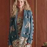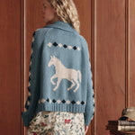 The Stable Lodge Cardigan features a western horse motif—a playful detail inspired by a 1960s children’s sweater. Spun from a soft cotton/alpaca yarn, it’s cozy, comfortable, and full of character. Designed for intentional ease throughout the body. Size down for a smaller fit.
