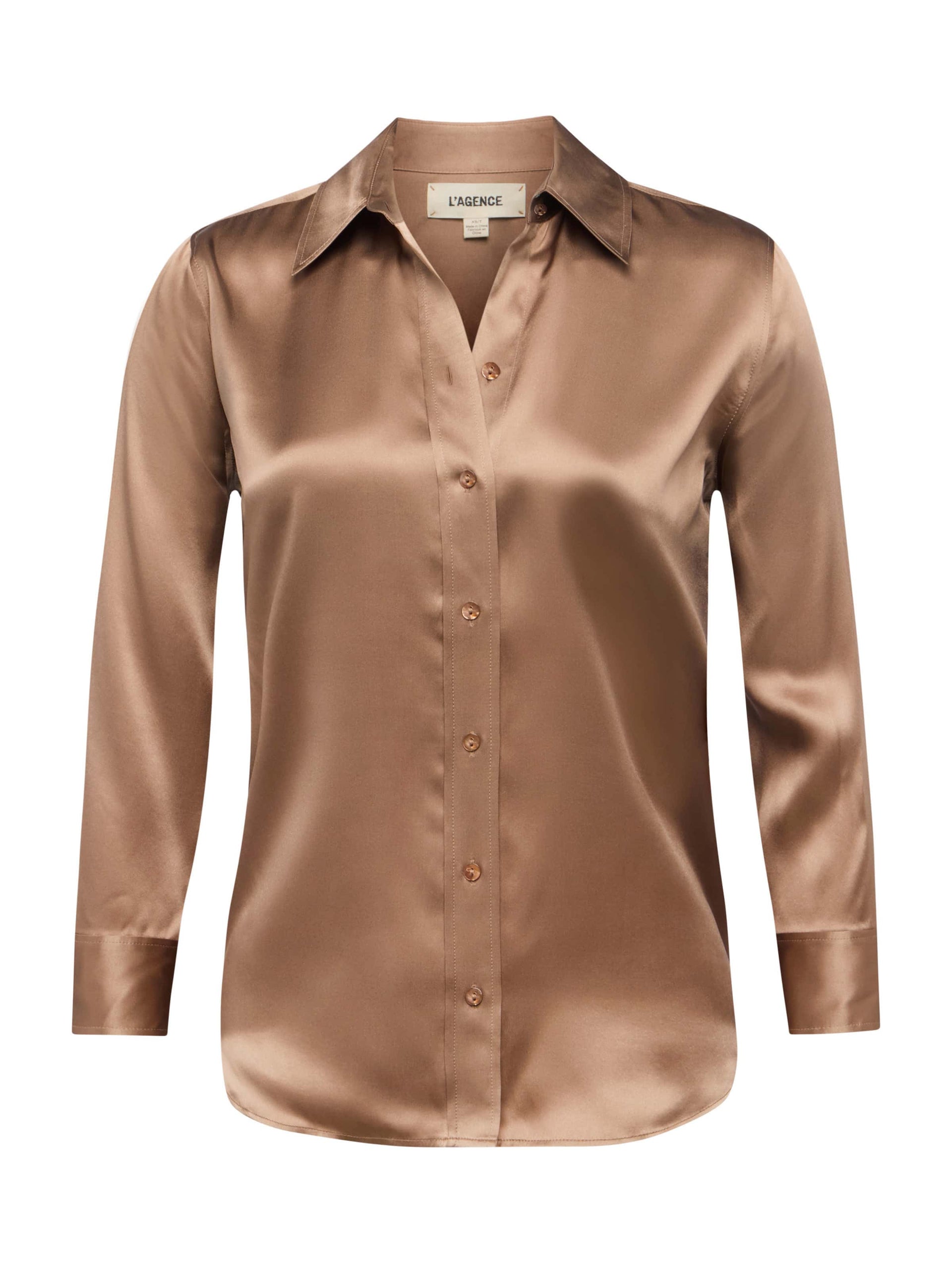 A classic button-down blouse with a luxurious, light-catching luster. Charmeuse silk drapes effortlessly to a shorter, curved hem. Three-quarter-length sleeves and a relaxed open collar balance elegance with wearability.