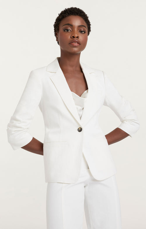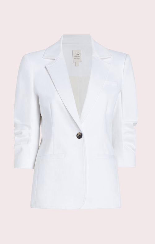 The Khloe Blazer is the most versatile piece you'll own. The white denim, single button closure, and 3/4 length sleeves with subtle ruching details all add up to an effortless sophistication that pairs perfectly for all occasions.