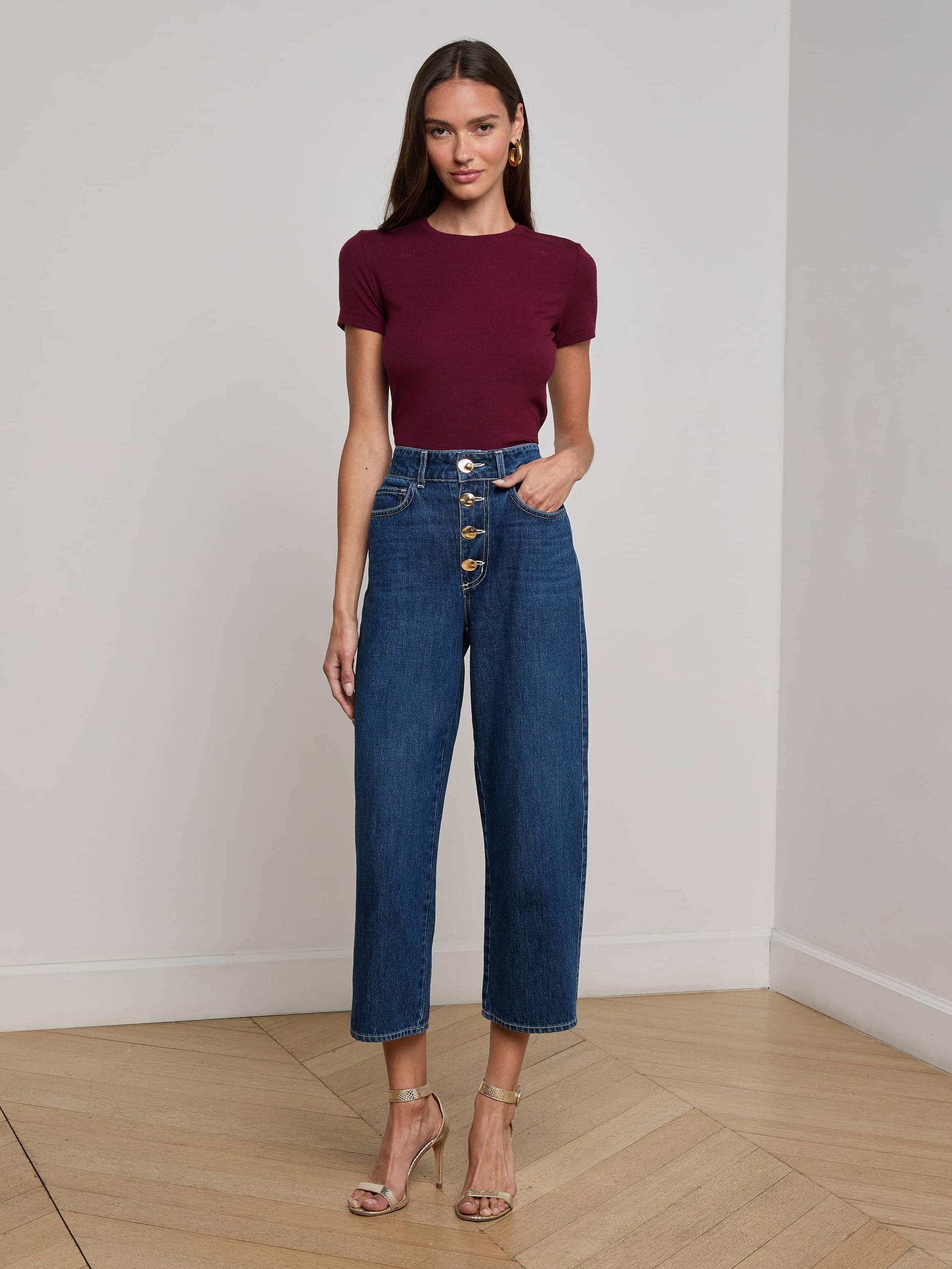 In a soft, supple fabrication and slim cut, Ressi is the most flattering short sleeve tee. Reimagined in new prints and colorways every season, she’s a L’AGENCE favorite year after year. Now back in burgundy.