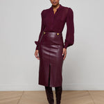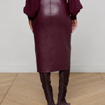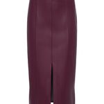 Sleek and sophisticated, this midi skirt is crafted from rich vegan leather in a deep port hue. Tonal whipstitch seaming and gold crest buttons lend a polished finish, while the front slit brings in the attitude. Pair it with a tucked-in blouse or sharp blazer for desk to drinks.