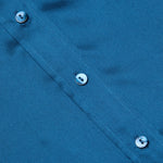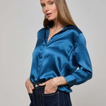 Meet the iconic silk button-down that belongs in every wardrobe. This signature three-quarter sleeve shirt is back in stone blue.