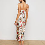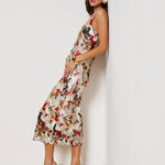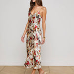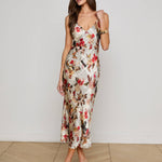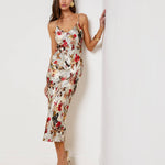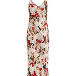 The iconic silk slip dress, now back in a new version of this signature newspaper print, overlaid with vibrant florals and butterflies.
