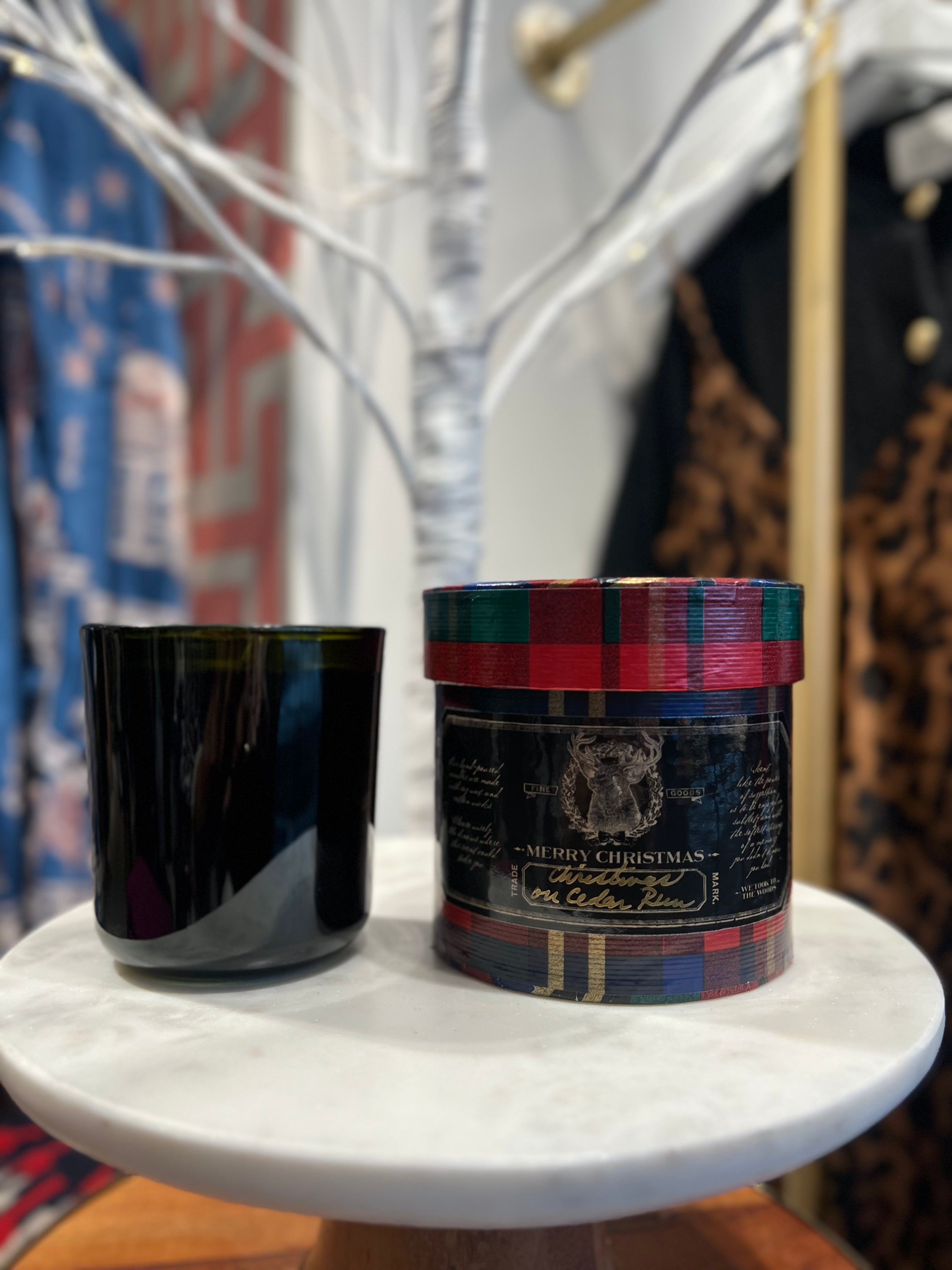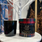 Classic glass container with gold tree in hand-papered tartan packaging.