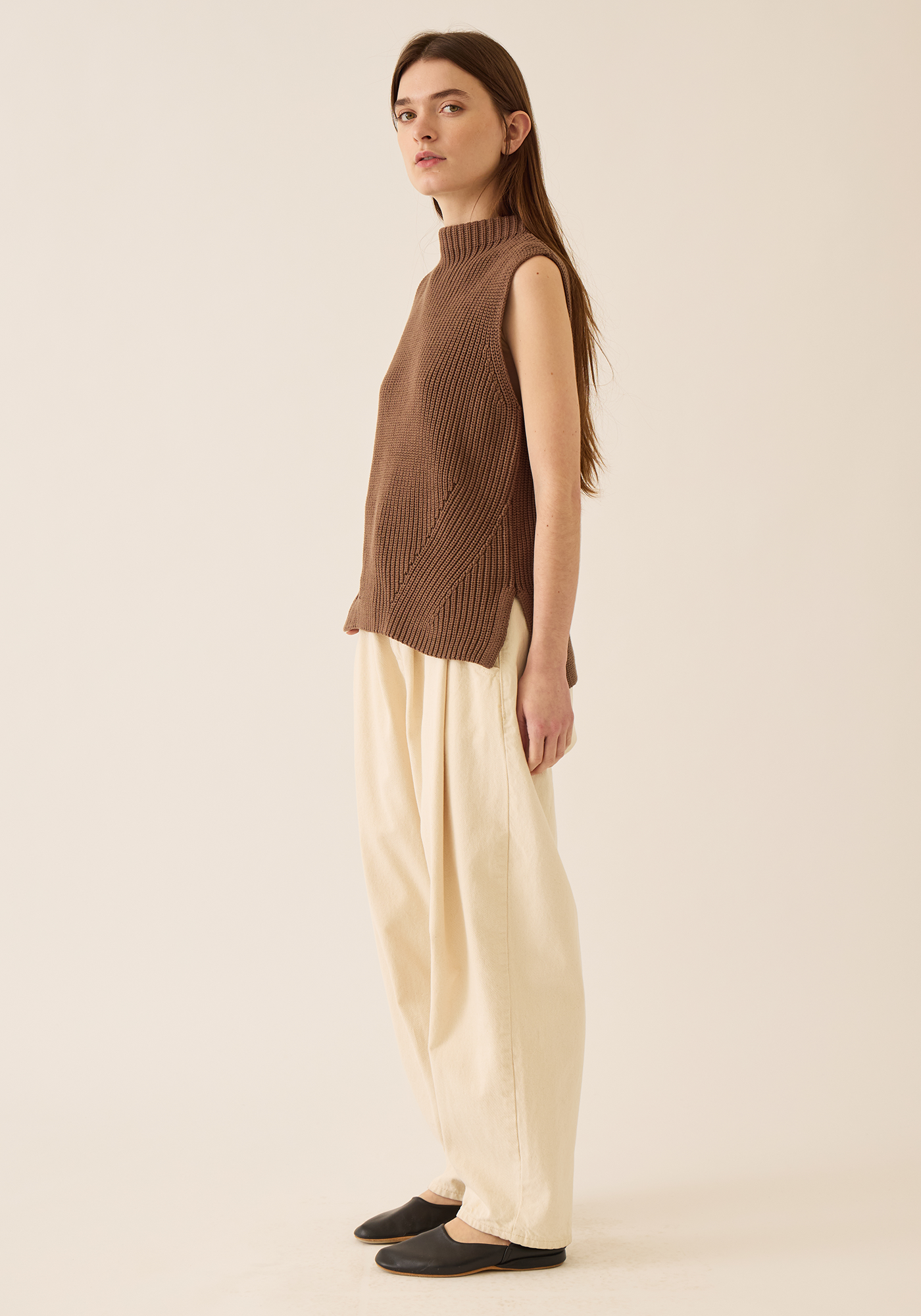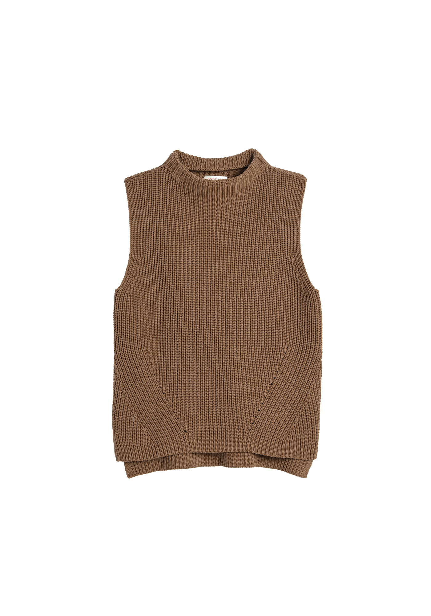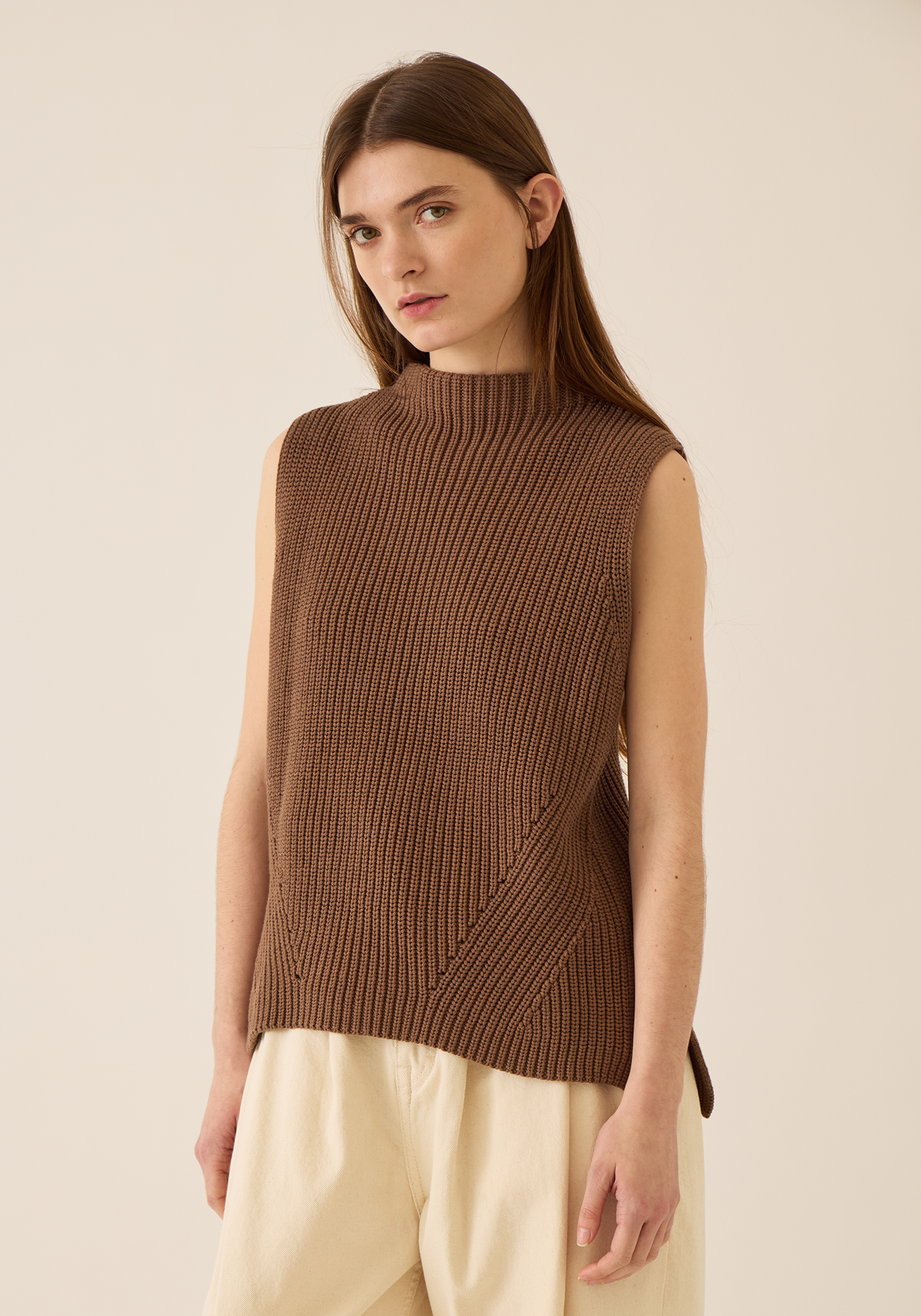 Mock neck sleeveless vest in ribbed texture. Side vents at hem. Relaxed fit.