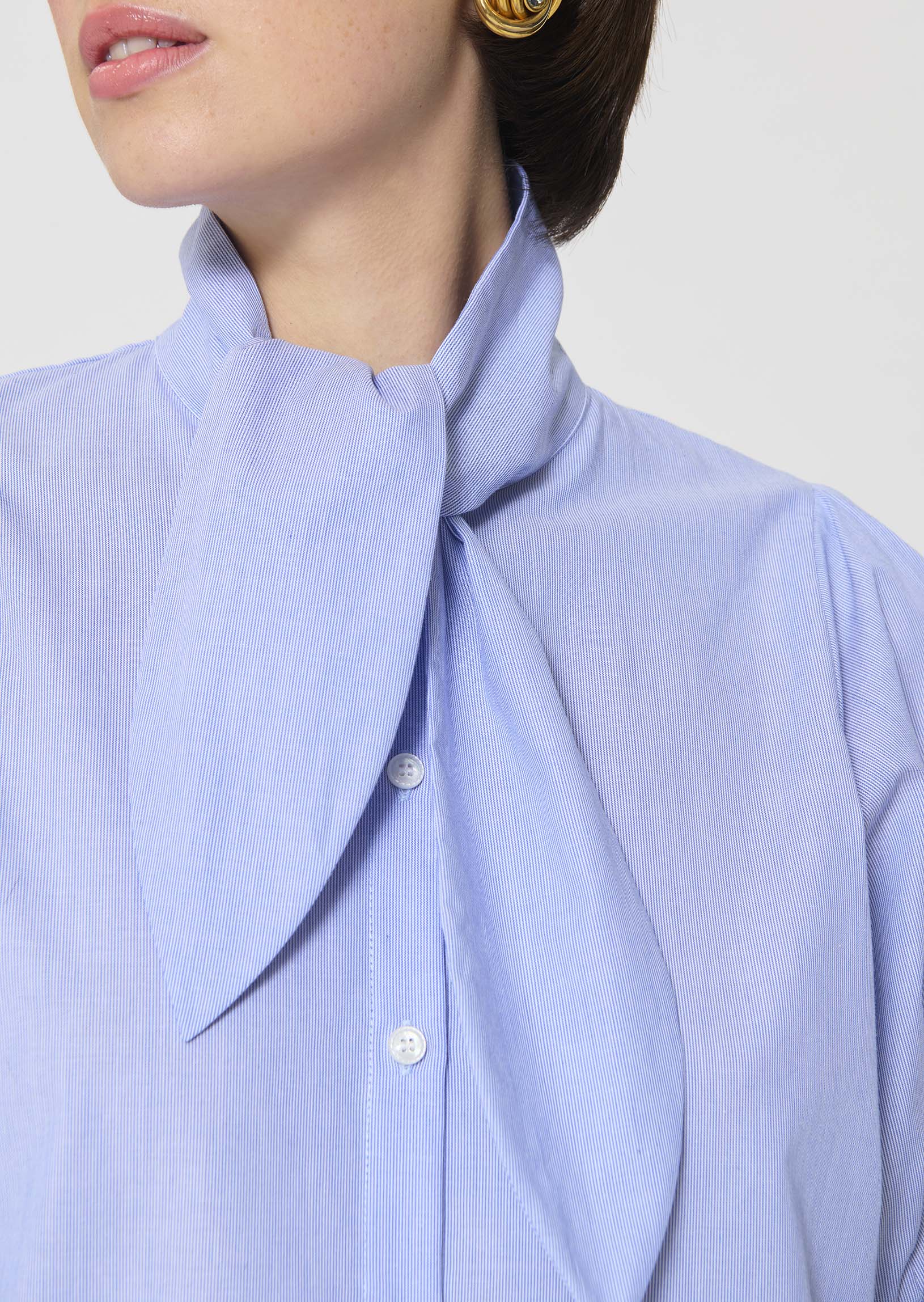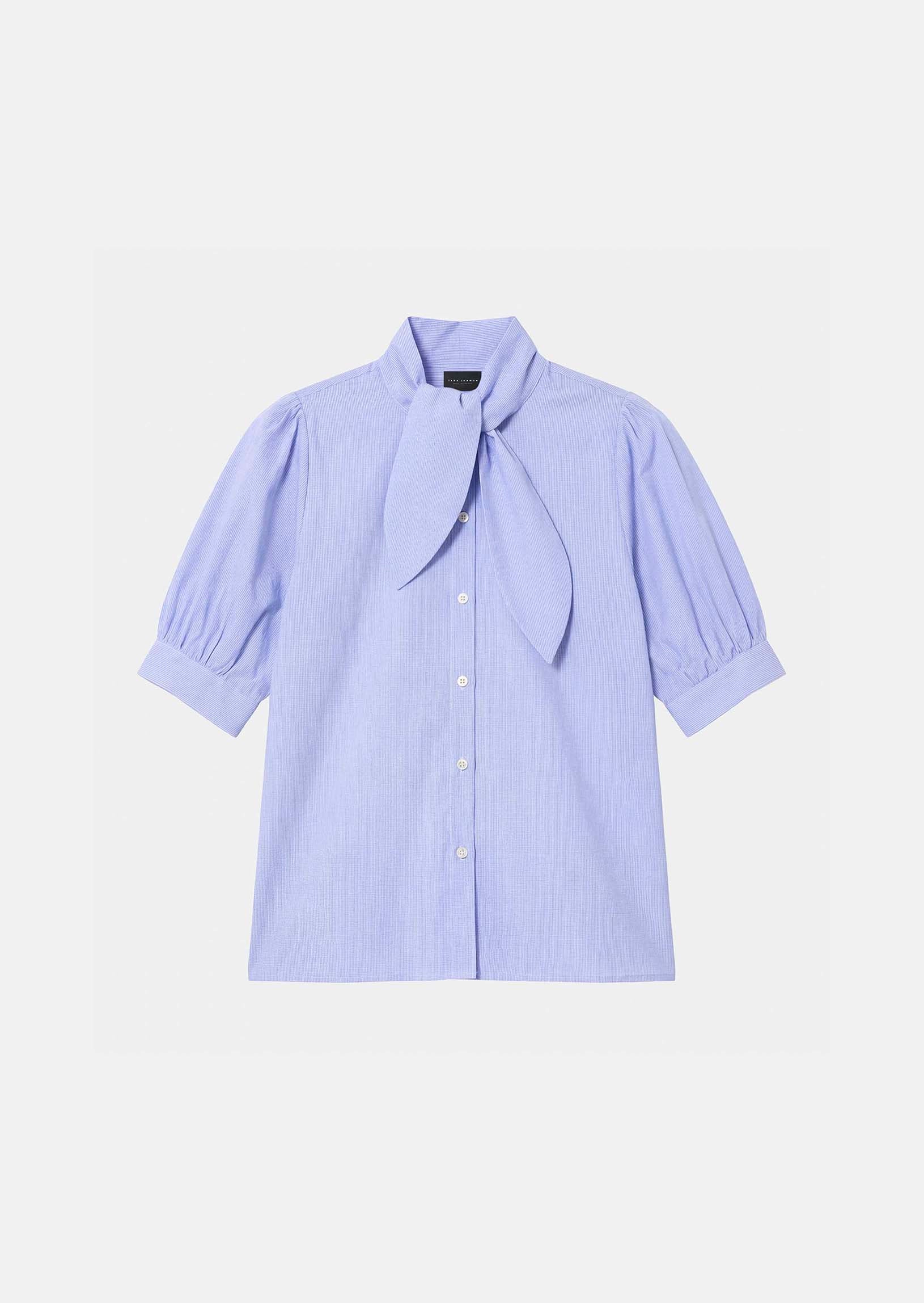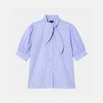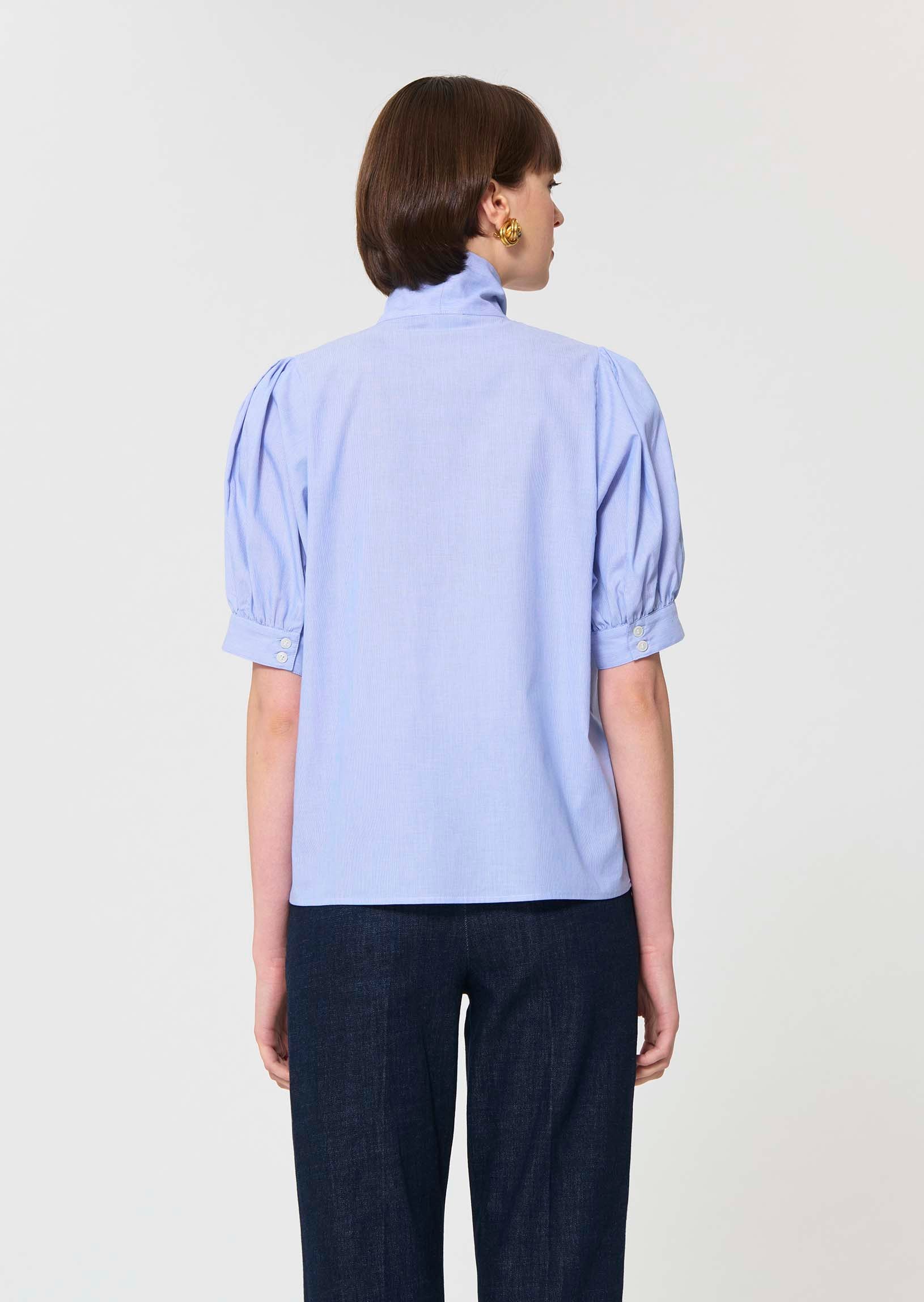 This blue, finely striped cotton shirt has short balloon sleeves and a tie-neck lavallière collar. Its straight cut is fastened at the front with small, tone-on-tone buttons.