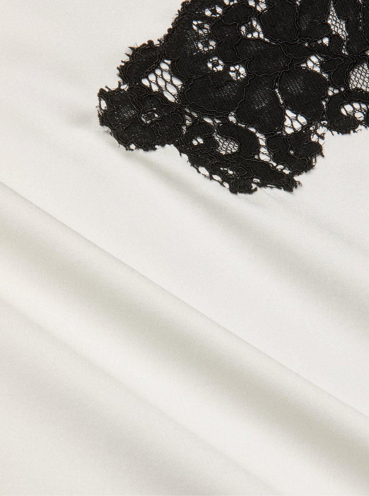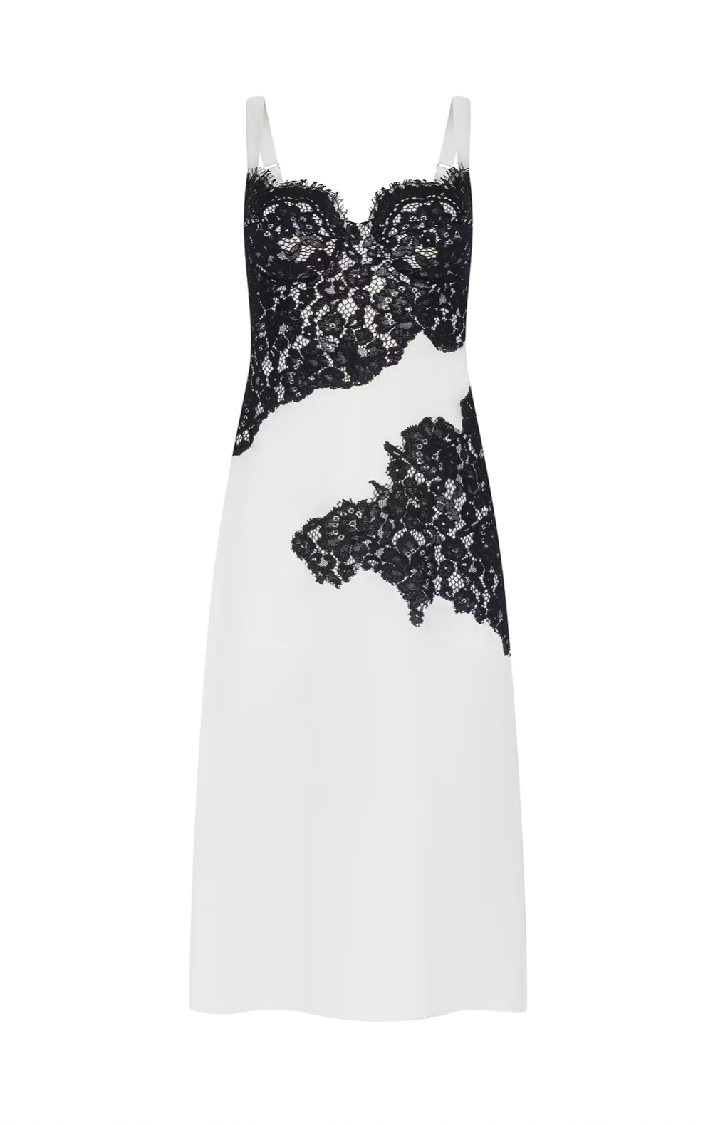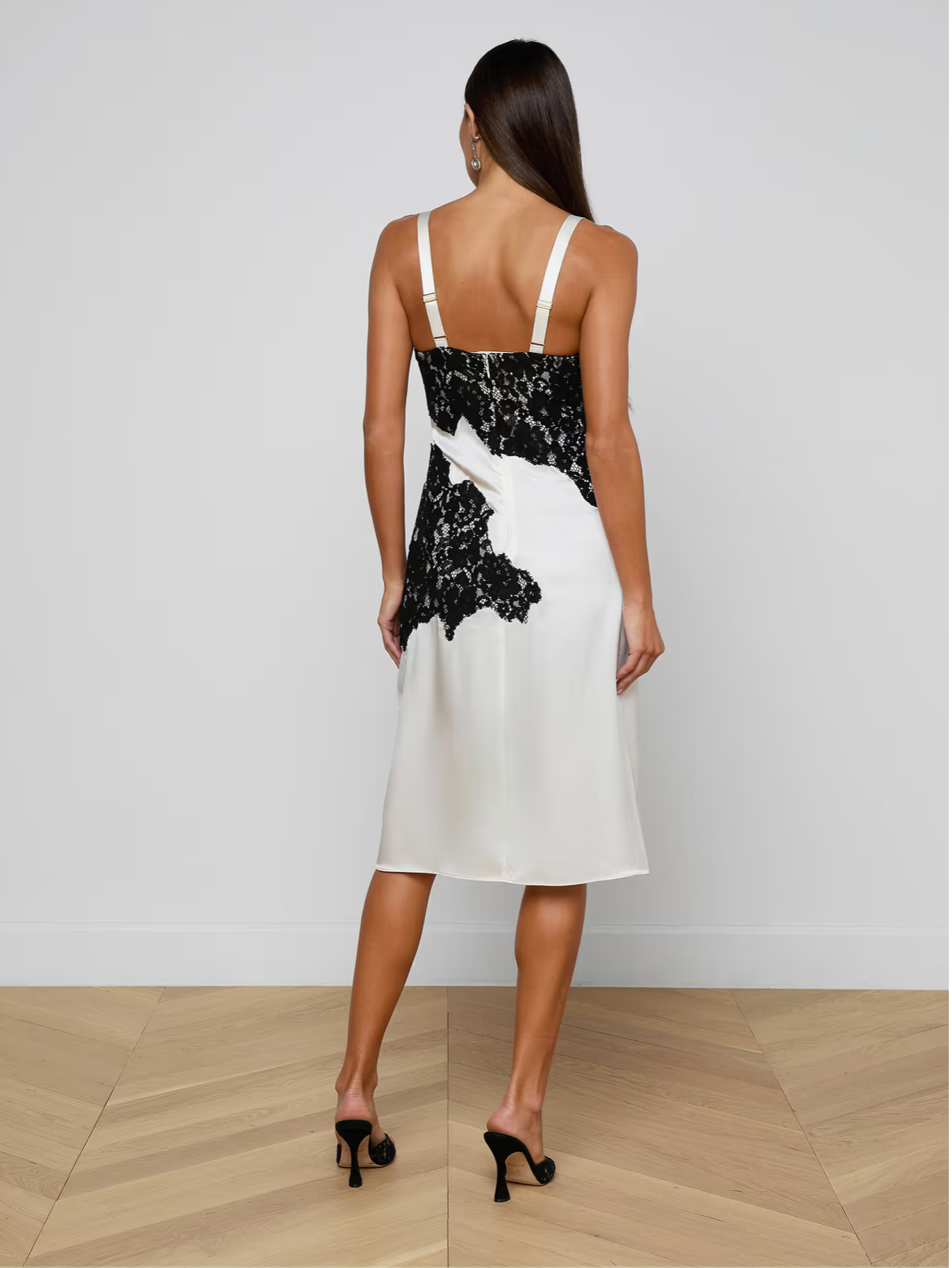 The Fenna blends fluid elegance with intricate detail. Black lace appliqué traces the bodice and skirt, creating a striking contrast against the ivory silk charmeuse. With its sculpted bustier top and effortless drape, this piece balances sensuality and sophistication.