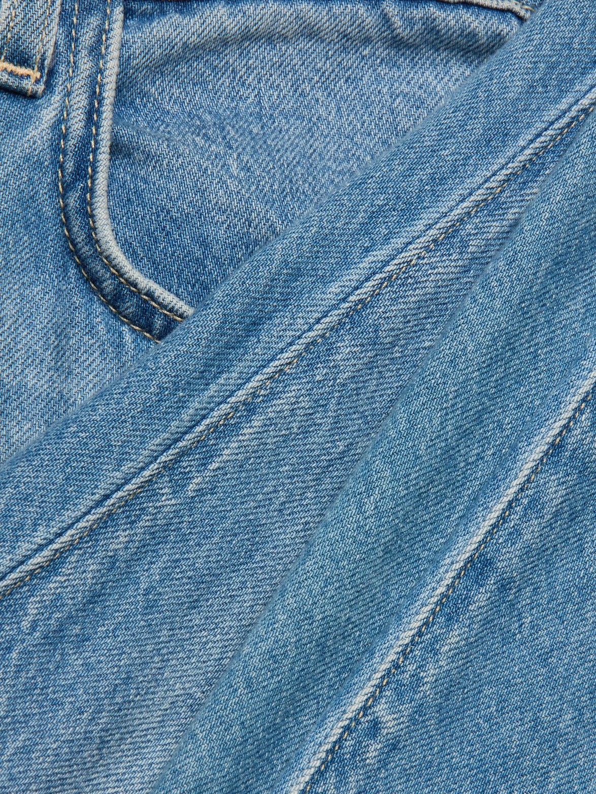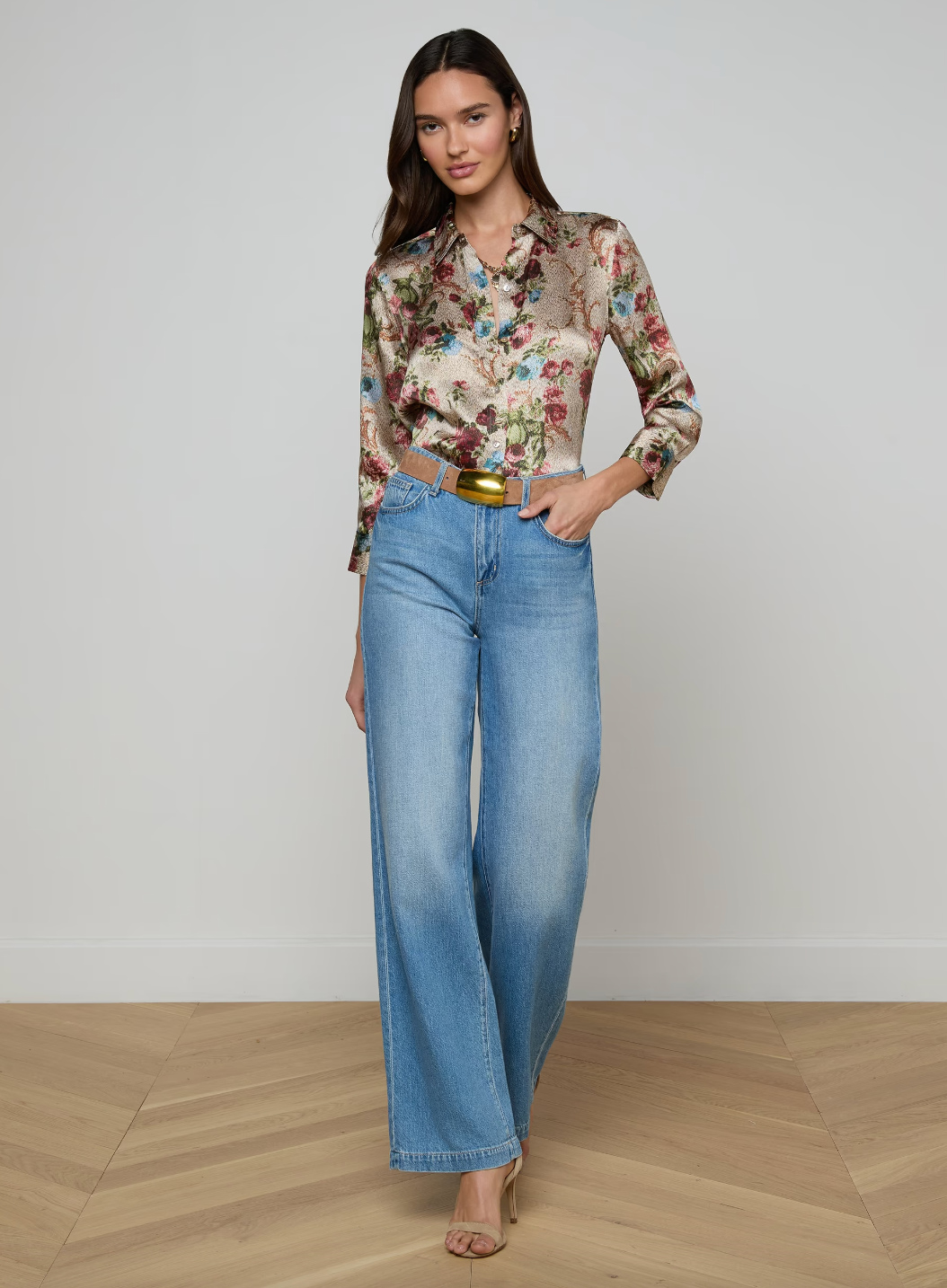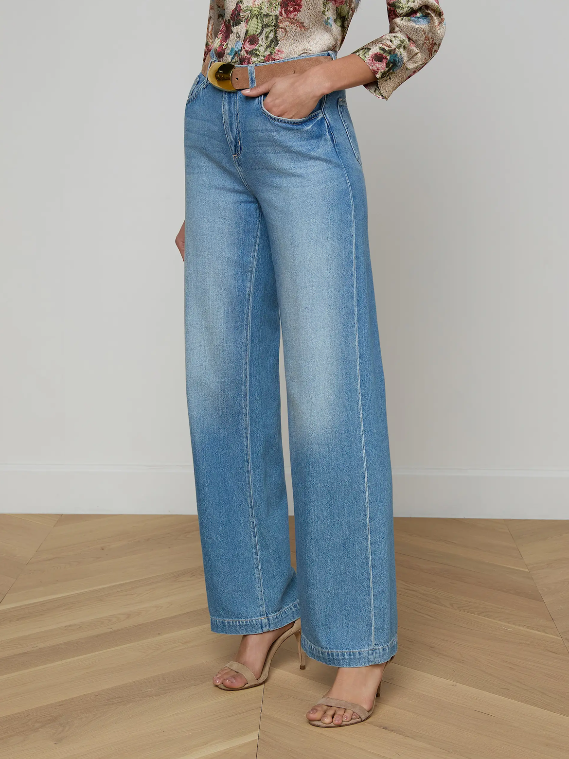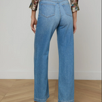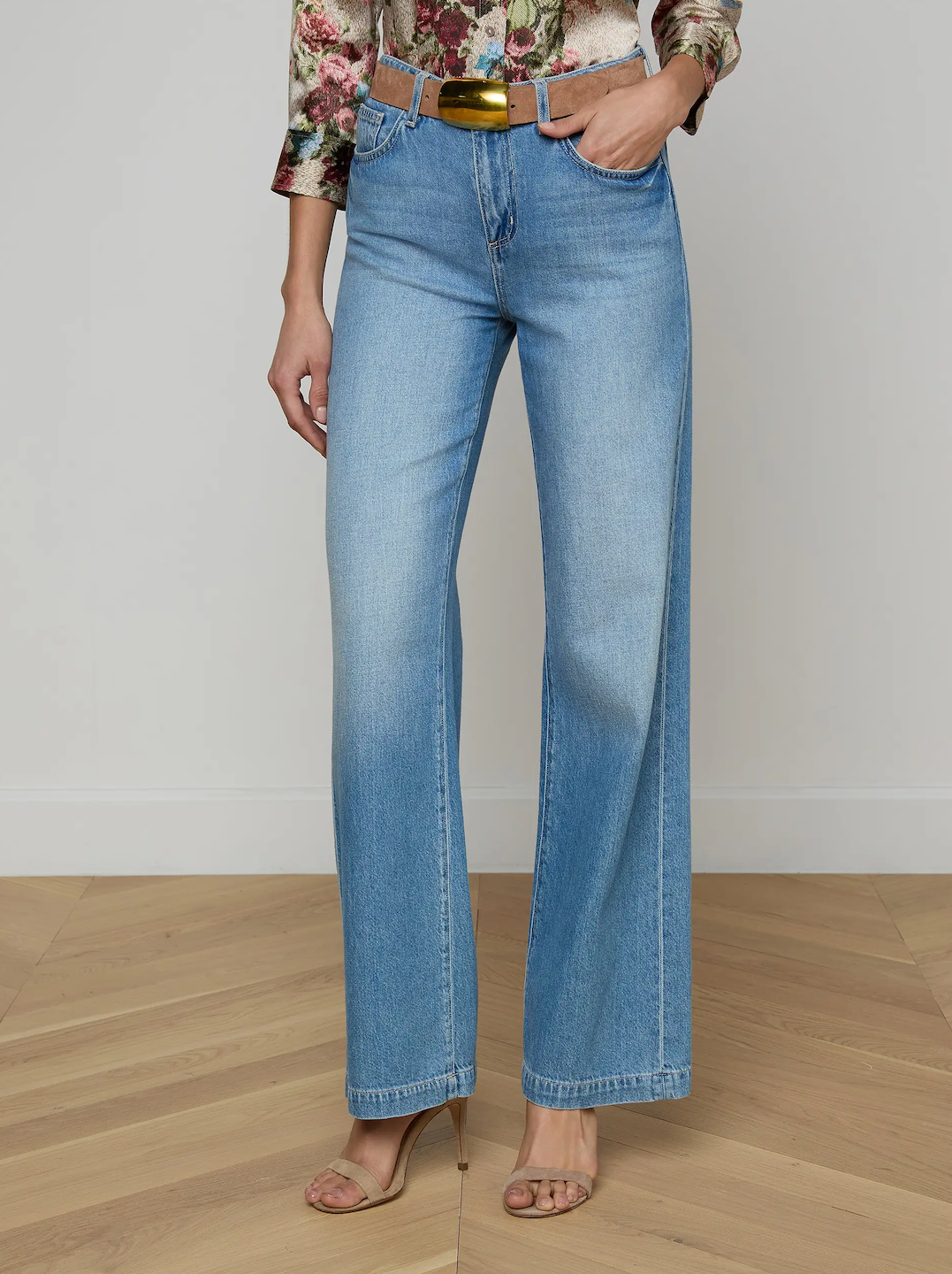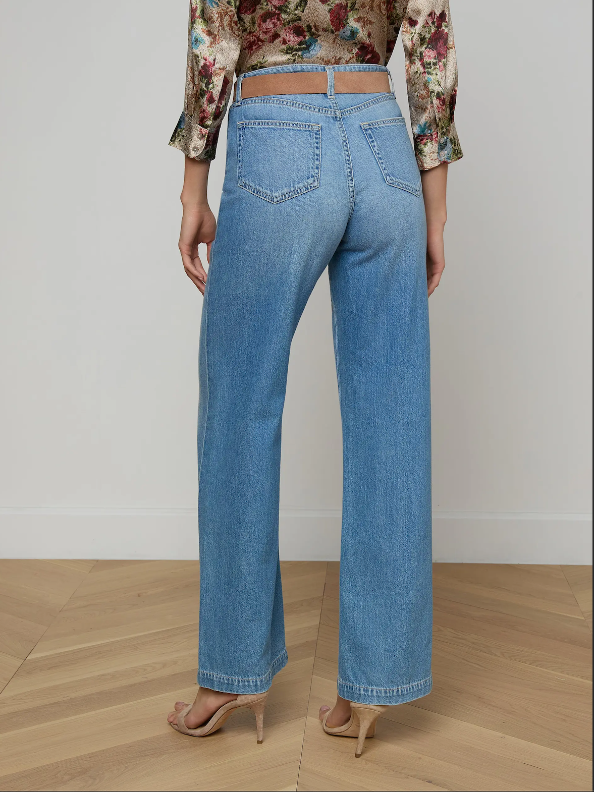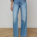 A polished wide-leg jean. A contoured waistband sits securely at the natural waist without gaping. Designed to run fitted through the hips before releasing into a relaxed leg, the Scottie is a flattering, perfect-for-everyday jean. Now in a light wash with subtle whiskering and fading details, designed to contour the leg for an elongating look.