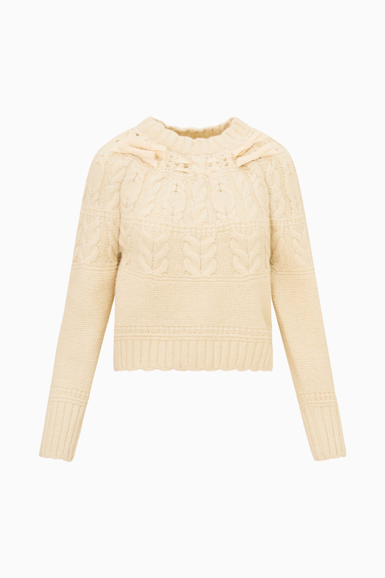 The Sloanna Pullover is a dreamy, fairytale-inspired sweater crafted from a lightweight Pujpu yarn—a soft blend of baby alpaca, nylon, and wool. This pullover features intricate cable stitch detailing reminiscent of classic Fair Isle, with velvet ribbons woven around the neckline that tie into delicate bows at the princess seams. Streamlined without a placket, the Sloanna Pullover is effortlessly cozy yet refined, perfect for layering or wearing on its own for a touch of whimsical elegance.