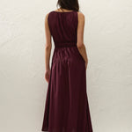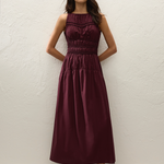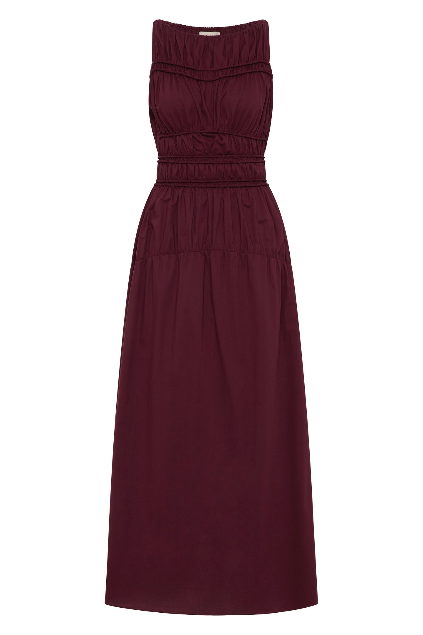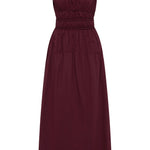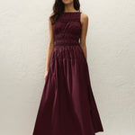 An effortless midi dress, designed from a signature 100% cotton, yarn-dyed in a deep mulberry shade. Sleeveless with a boat-style neckline, it offers a shirred bodice with cord elastic detailing for a more flattering finish. There is a subtly gathered drop waist that falls into a soft A-line skirt, cropping just above the ankles. With an ease of wear, style for transeasonal occasions. This style is true to size. The shirred bodice and cord elastic offer additional stretch.